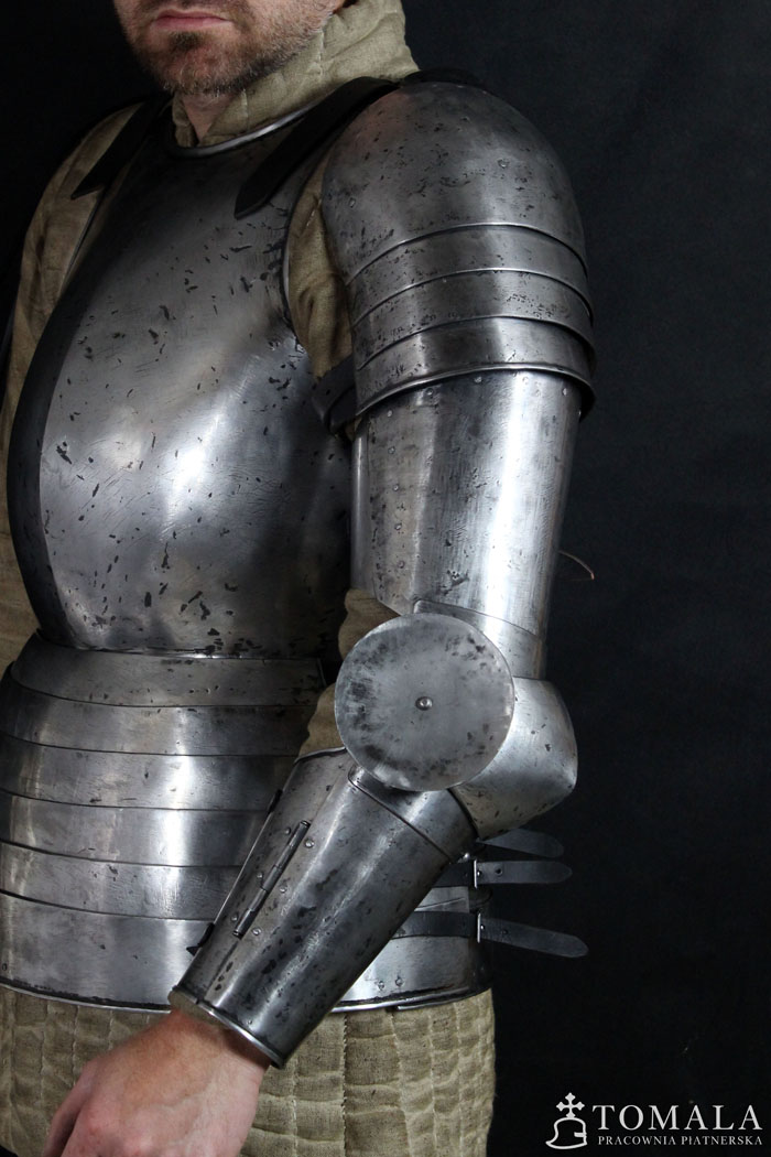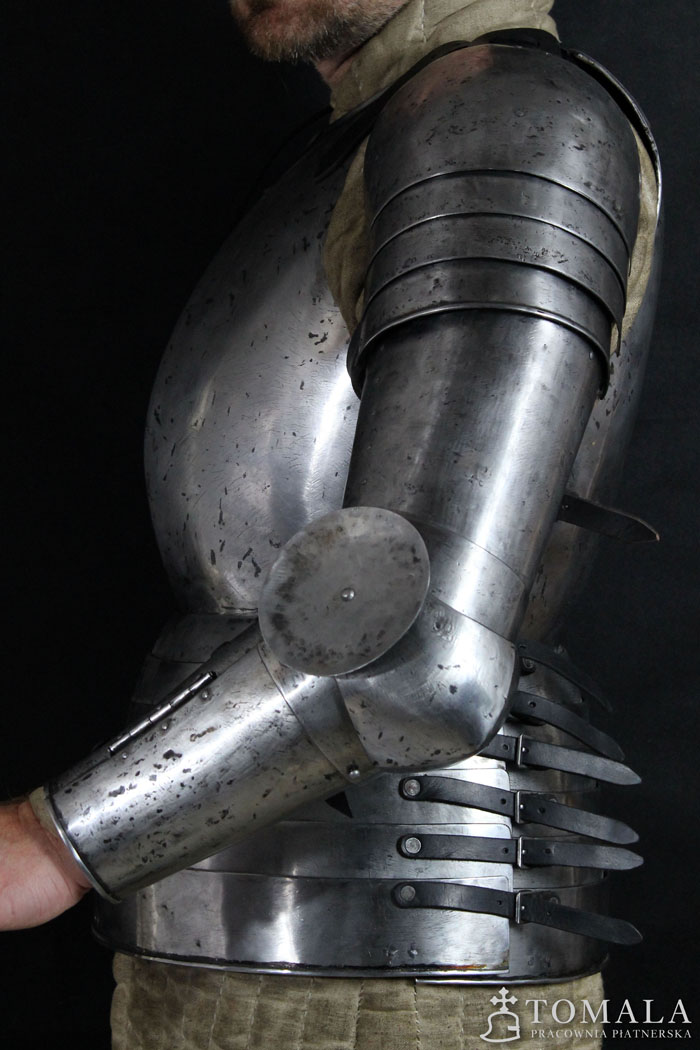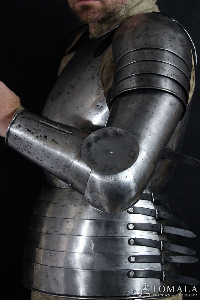 Arm cover (arm + pauldron) based on iconography of second half of 14th century and beggining of 15th century. The one on the picture is made of tool steel C45 and it costs 2400 euro. The same made of ordinary steel – 1975 euro. 1,5mm and 1,0mm thick steel. Surface is hammered and sanded, there are hammer marks left (*6), additionaly there are some file marks also. Product is not welded.