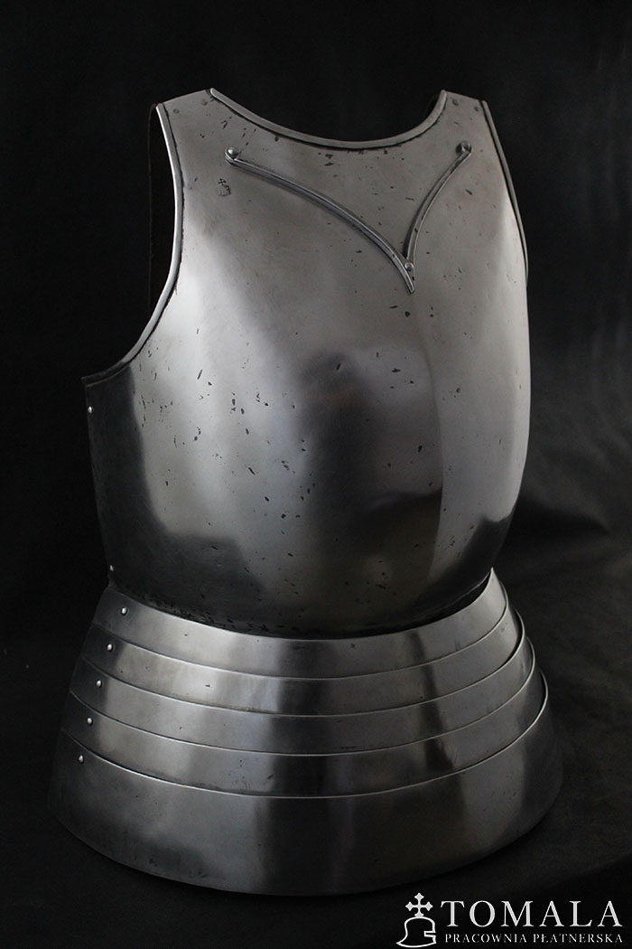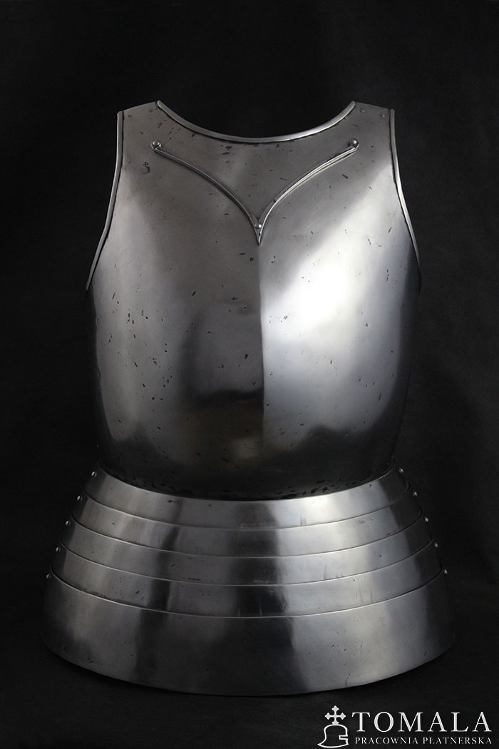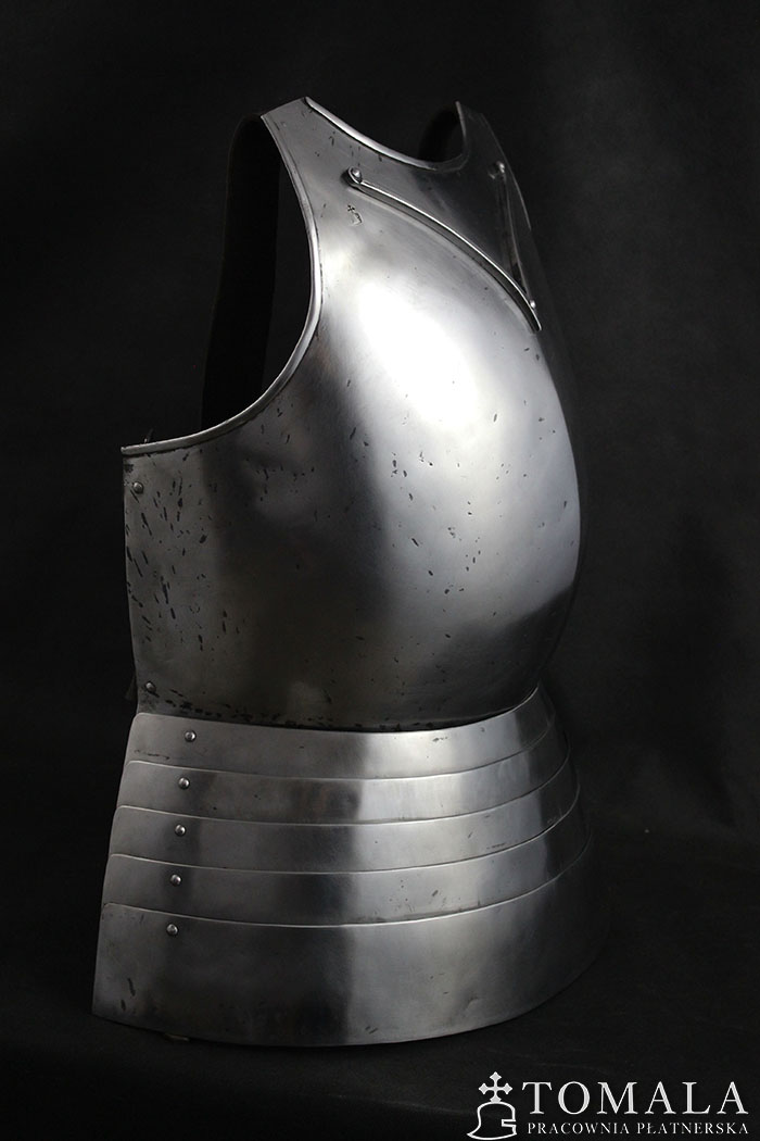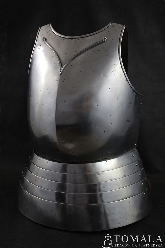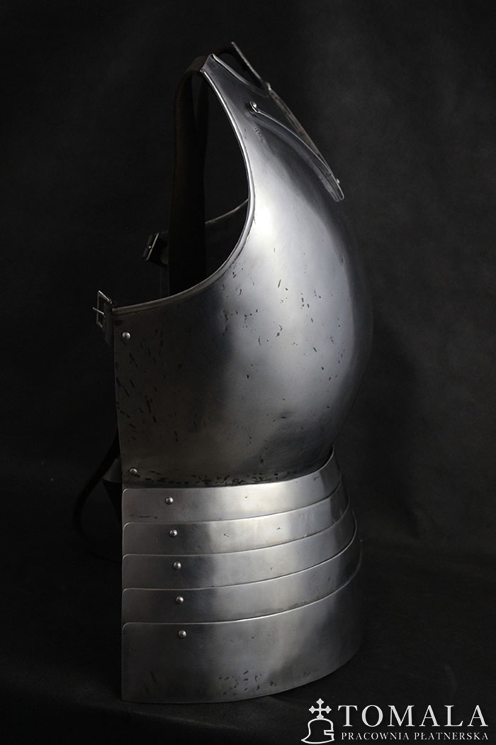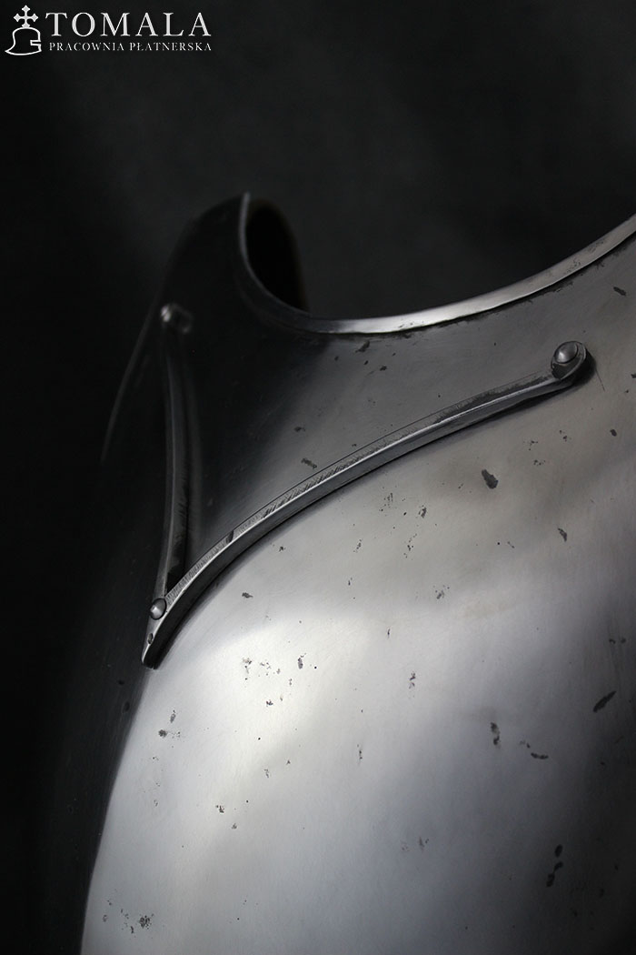 Breastplate based on graphical representation of altar in Pistoia cathedral. It is dated on year 1371. Additionally, the breastplate has a neck guard ‘V’. It is made of tool steel C45, 1,5mm thick and the faulds of 1,0mm. One can order this pattern made of ordinary steel in price of 1400 euro. Surface is hammered, sanded, hammer marks left (*6). Product is not welded.