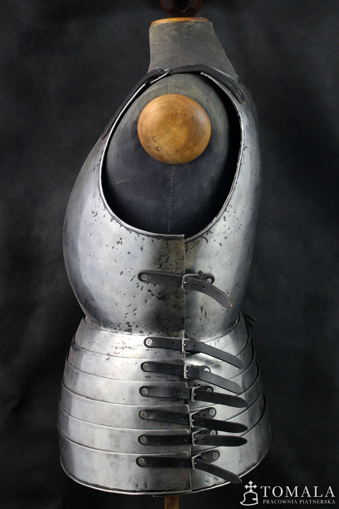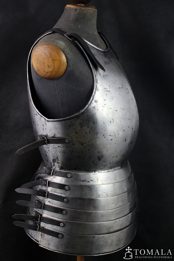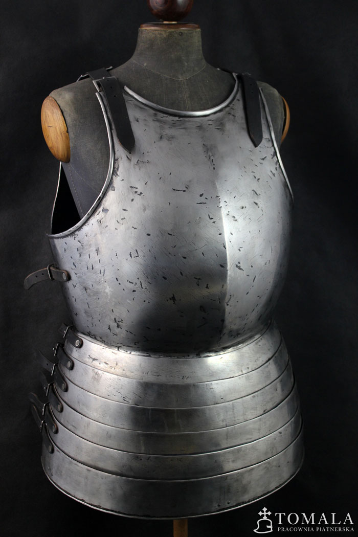 Curiass based on iconography from second half of 14th century and beggining of 15th century. The one on the picture is made of tool steel C45 and it costs 3500 euro. The same made of ordinary steel – 2870 euro. 1,5mm thick steel. Surface is hammered and sanded, there are hammer marks left (*6), additionaly there are some file marks also. Product is not welded.