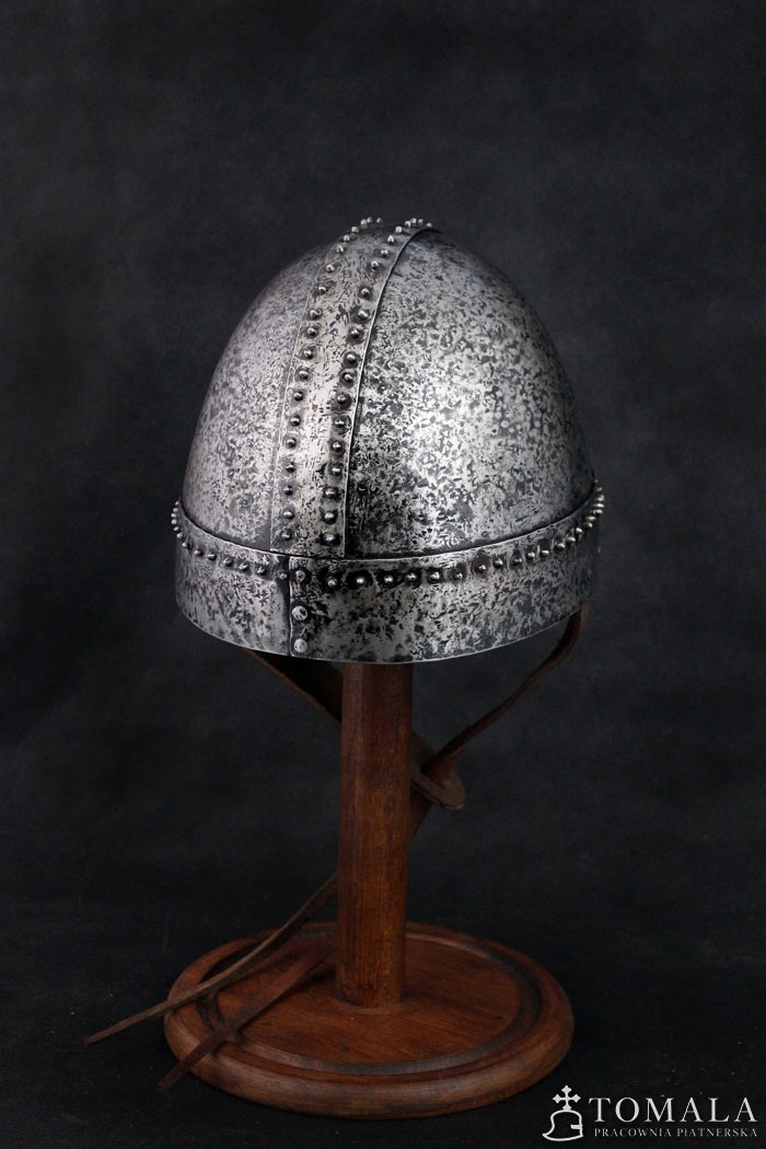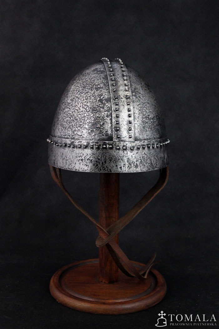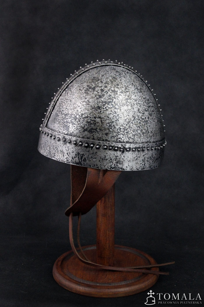 Helmet based on preserved original from 7-8th century, found in Prague. Rivets in shape of little spikes. Used material is 2,0mm and 1,5mm thick. Product is non-welded. Hammered surface (*4).