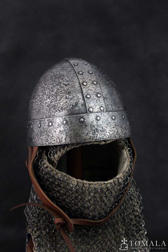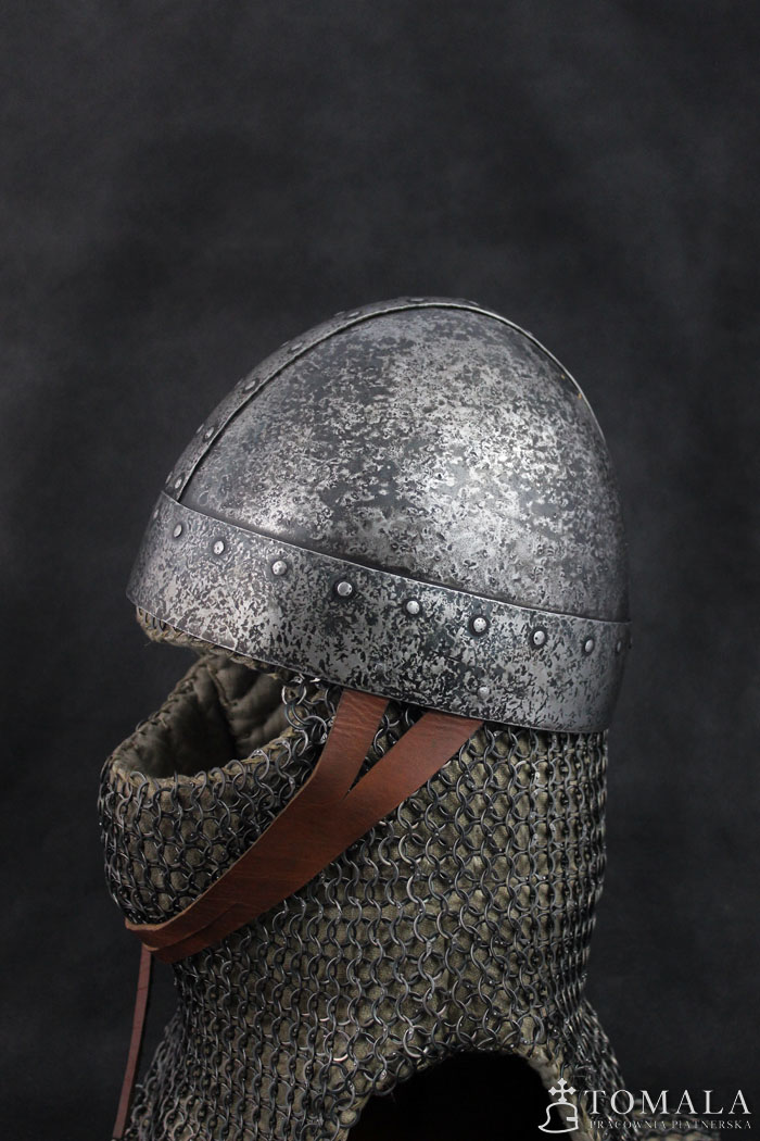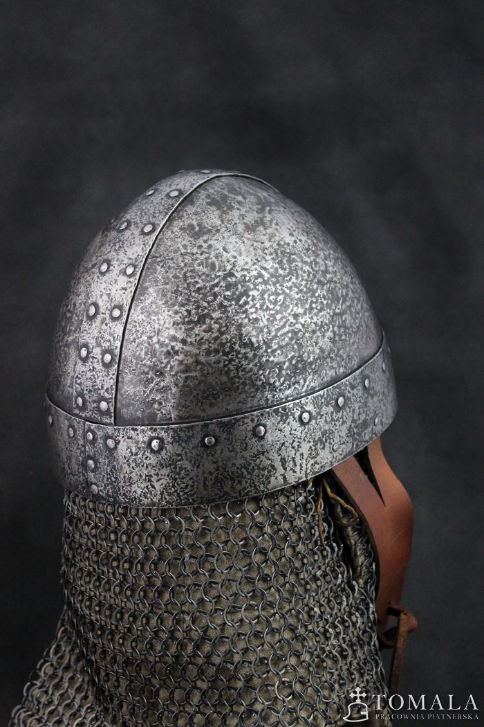 Similar helmets are known from preserved originals from 8th century. Basing on iconography one can assume, that this type was used in even much later times as quite simple helmet, used by not so wealthy ones. 2,0mm and 1,5mm thick steel. Product is non-welded. Hammered surface (*4).