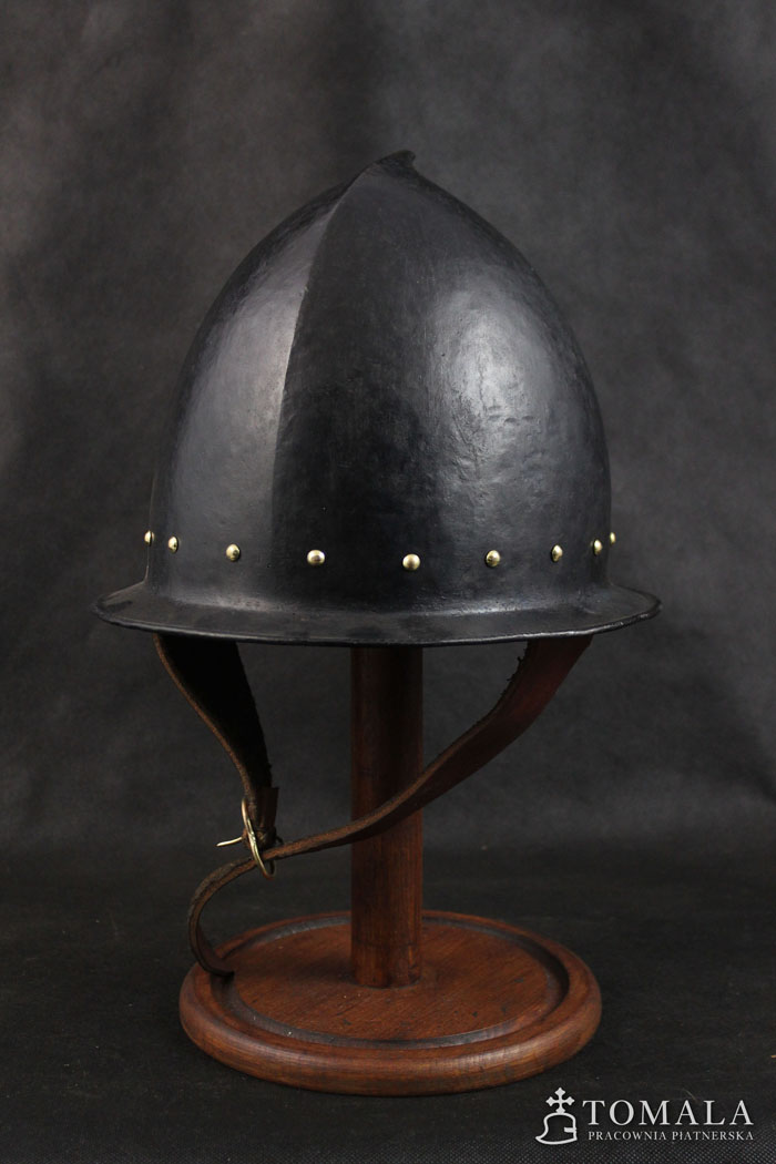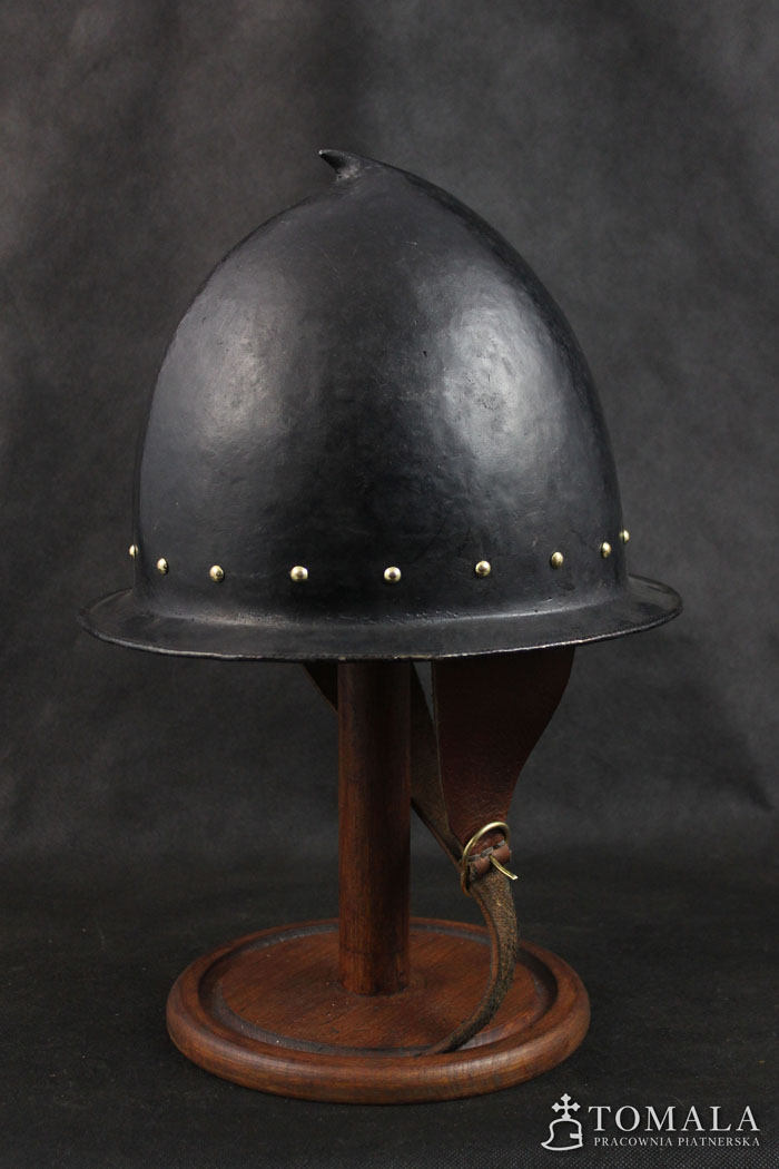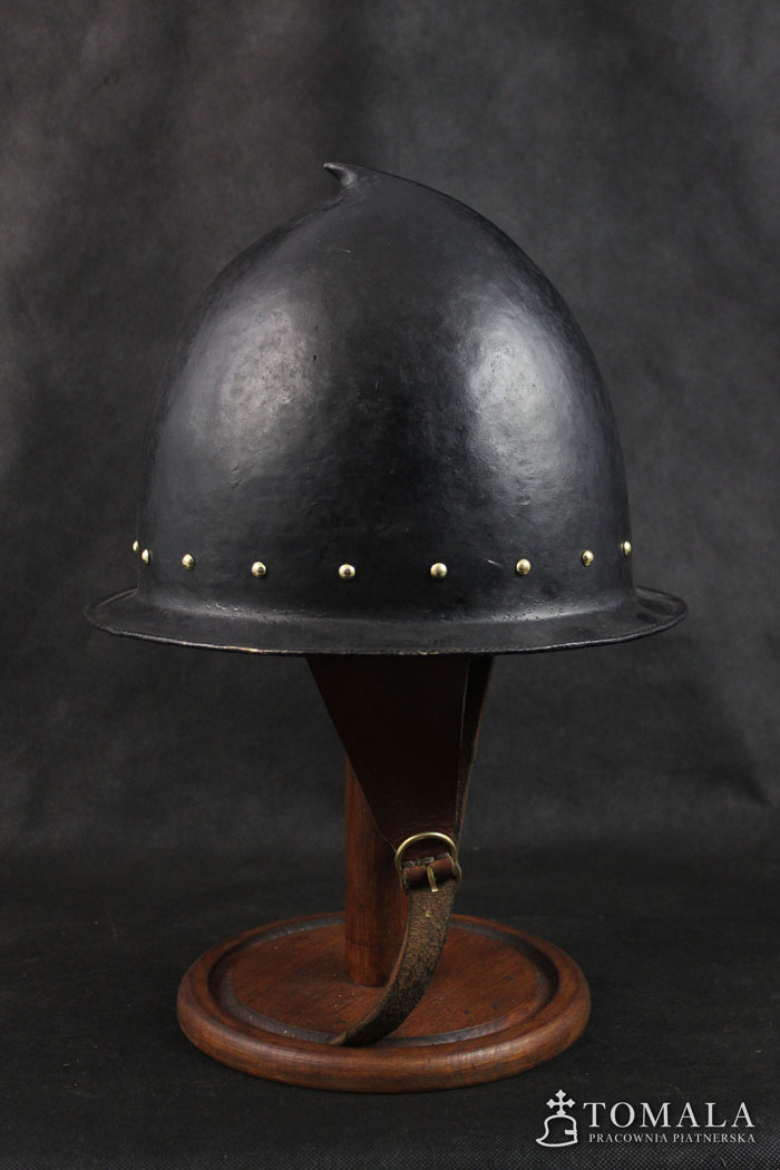 Cabasset, infantryman helmet from 17th century. Surface – hammered, blackened with a beeswax (*5). This helmet is welded in 2 parts, made of 1,5mm steel. On request, I can do this model without welding (helmet hammered from a 1 piece of steel).