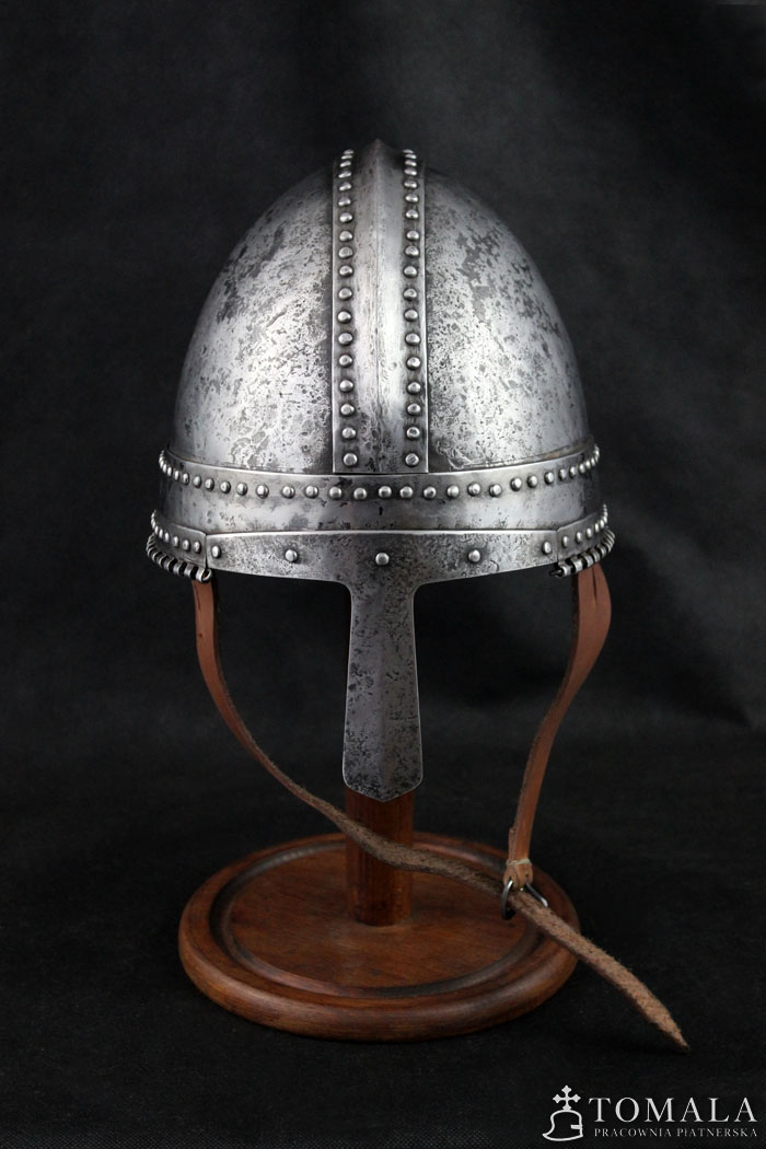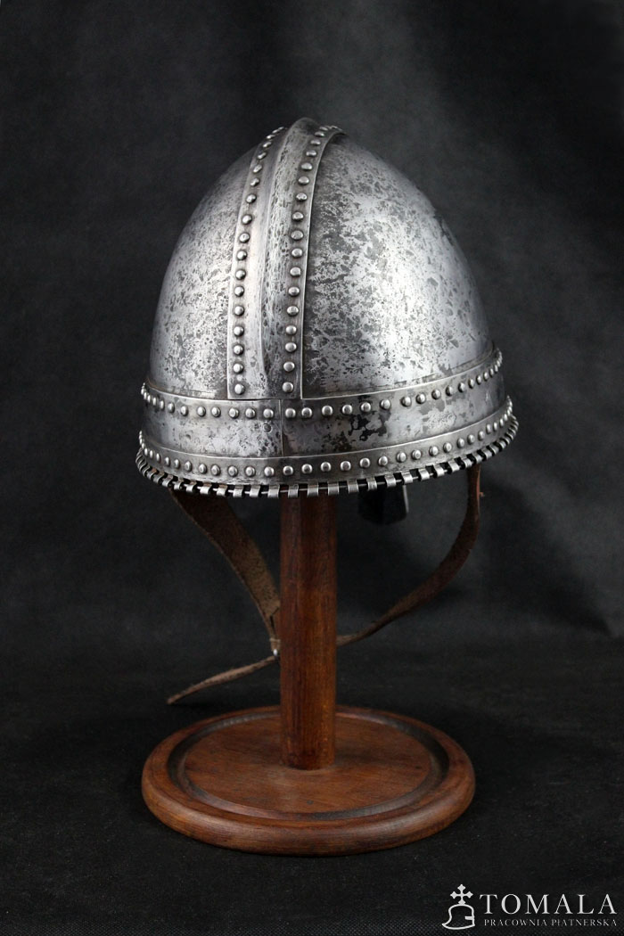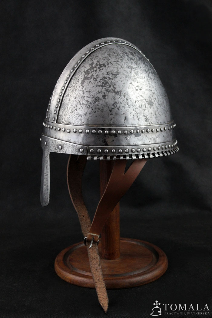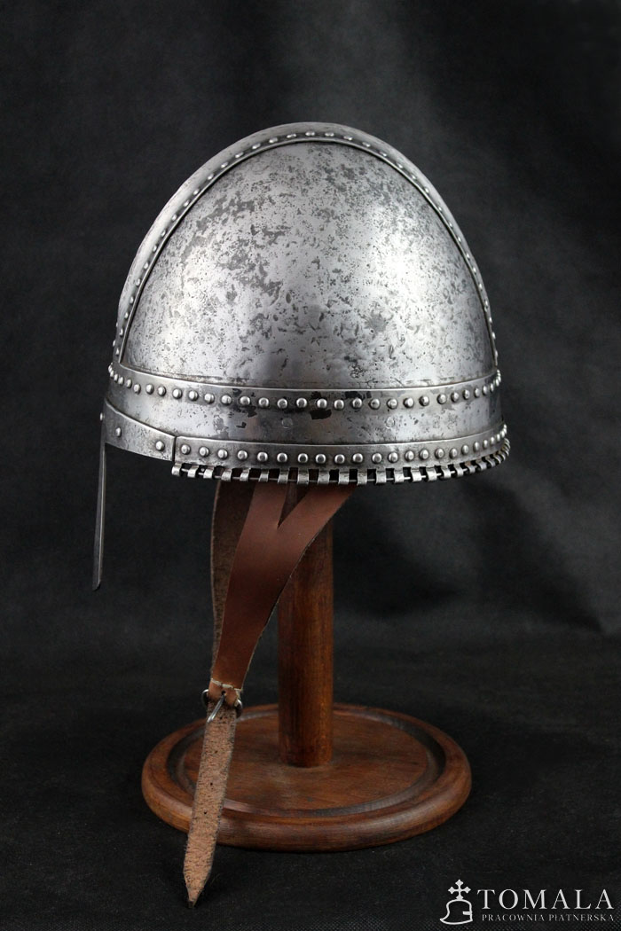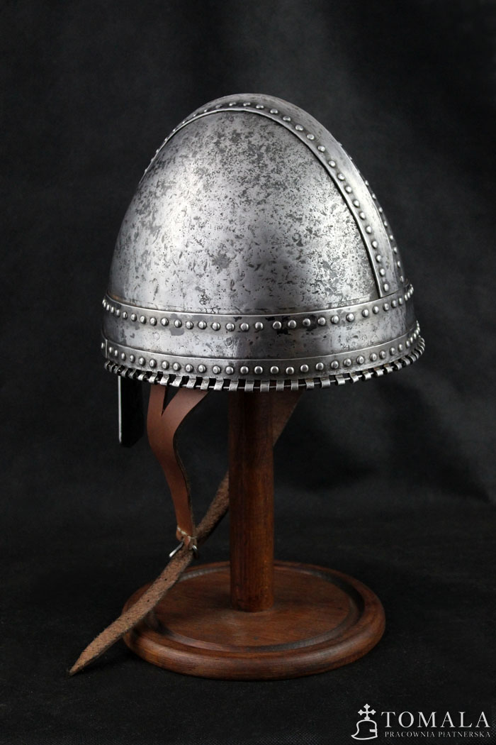 “Stromovka” – reconstruction of helmet from the lands of Great Moravia. There are 4 helmets of this type preserved, two in Stromovka, one in Gniazdow (Kievan Rus’) and one in Bojná (Slovakia). Bojná exemplar has a nasal. Dating of this helmet accordingly to different sources: from 8th to 10th century. 2.0mm and 1.5mm thick steel. Hammered surface (*4). Product is not welded.