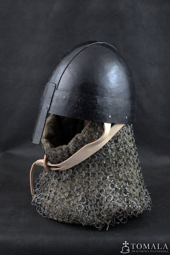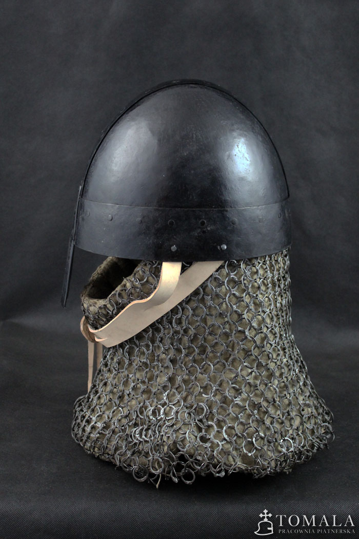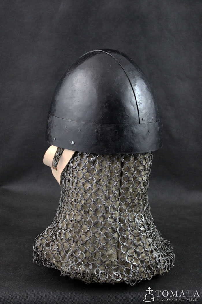 Similar helmets are known from preserved originals from 8th century. Basing on iconography one can assume that this type was used in even much later times as quite simple helmet used by not so wealthy ones. 2,0mm and 1,5mm thick steel. Surface hammered, blackened with beeswax (*5). Product is non-welded.