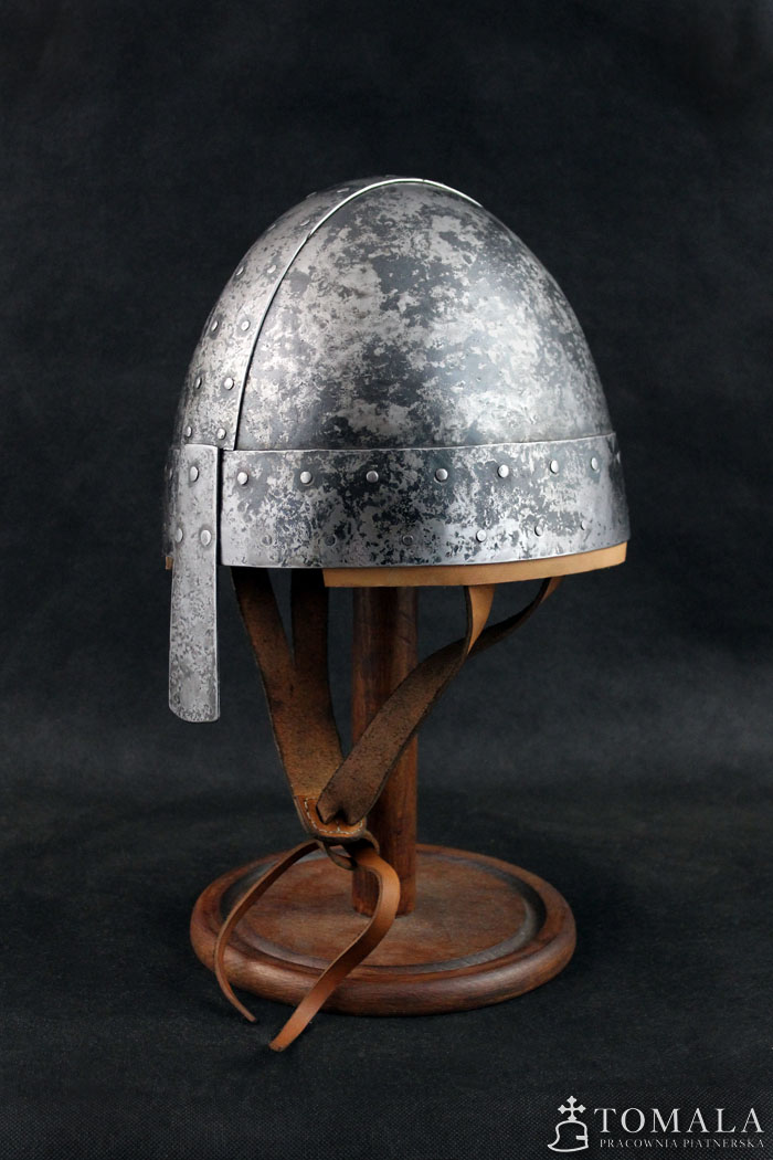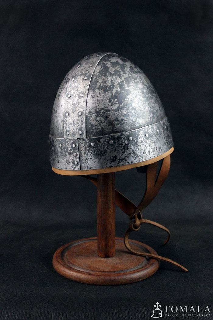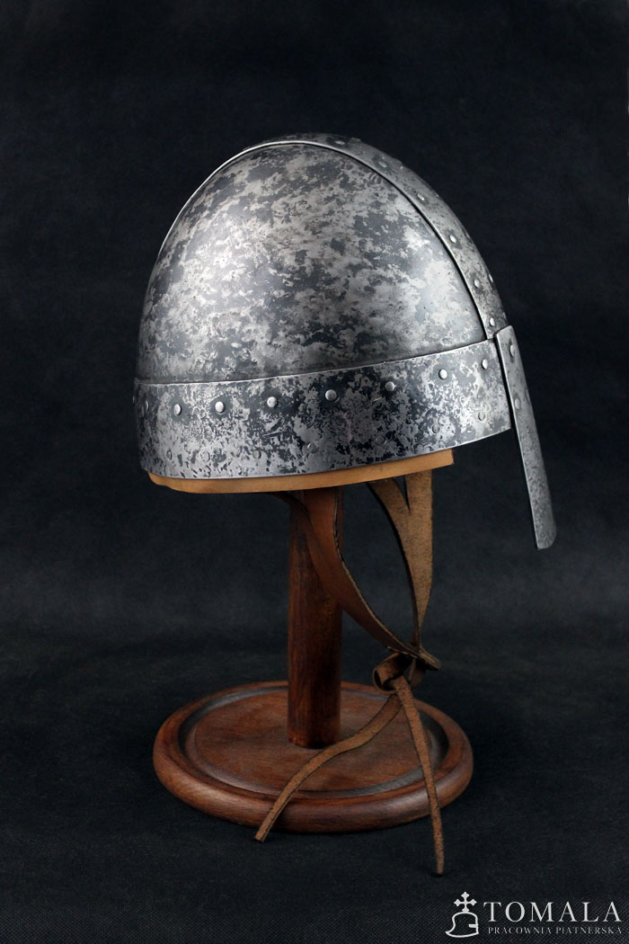 Similar helmets are known from preserved originals from 8th century. Basing on iconography one can assume that this type was used in even much later times, as quite simple helmet used by not so wealthy ones. 2,0mm and 1,5mm thick steel. Hammered surface (*4). Product is non-welded.