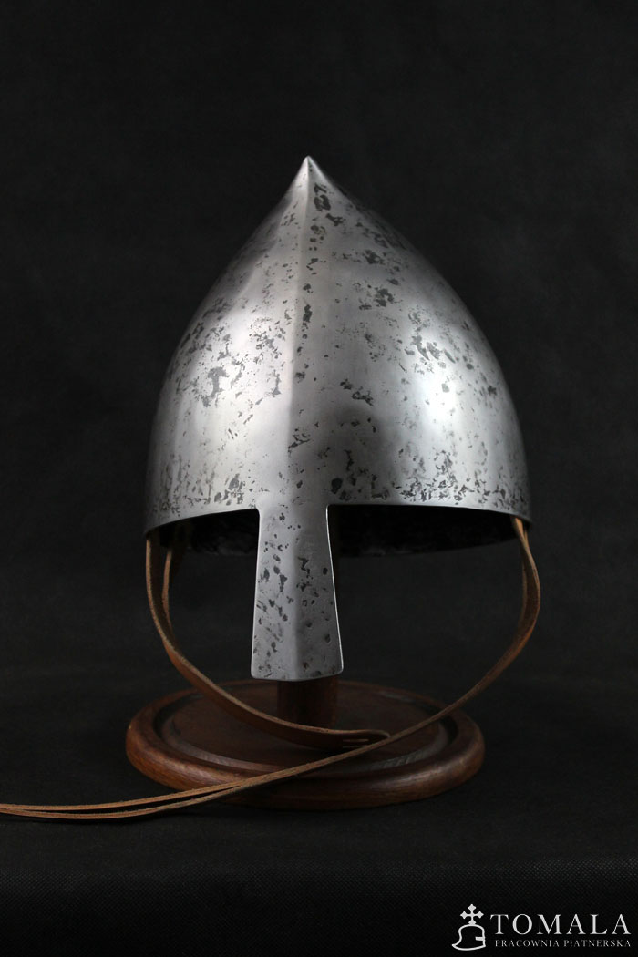 Phrygian helmet inspired by the iconography from the 12th-13th century. The bowl comprised of two halves. It’s hammered of 2mm steel. On request, I can do this model without welding (helmet hammered from a 1 piece of steel). Surface hammered and slighty polished, hemmering marks (*7).