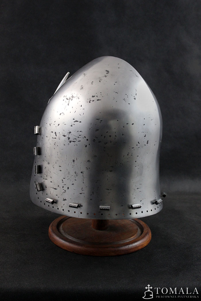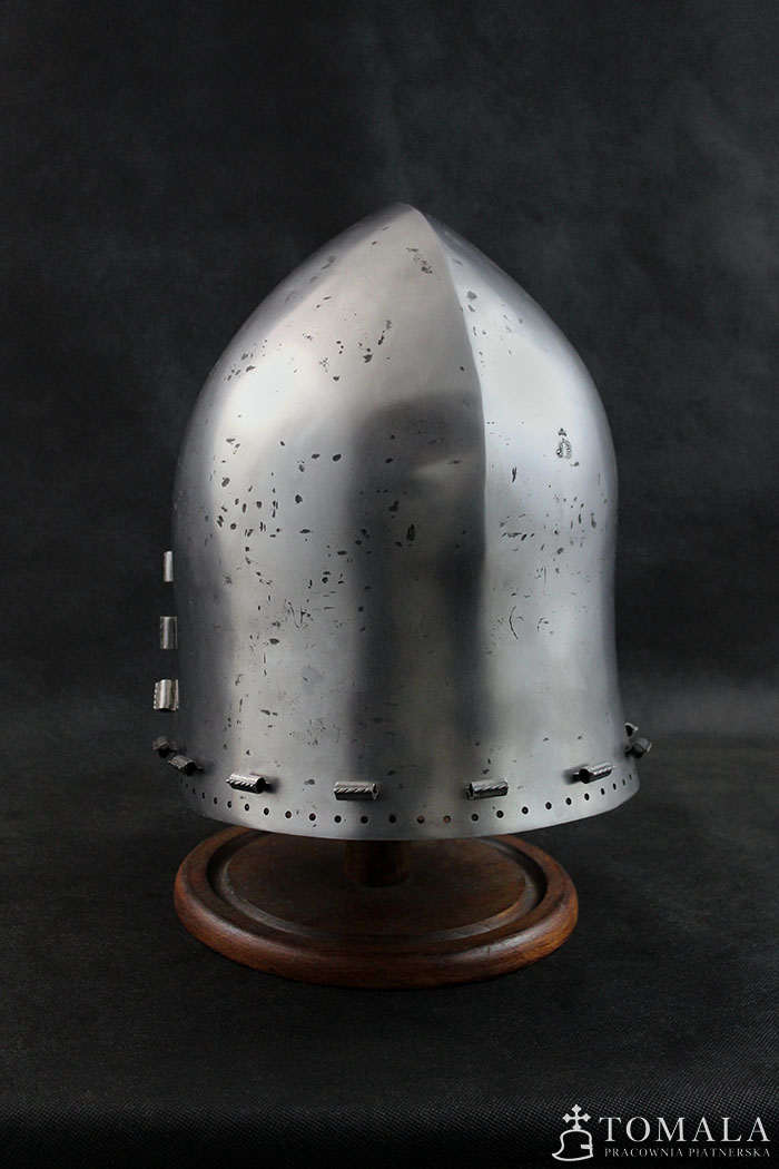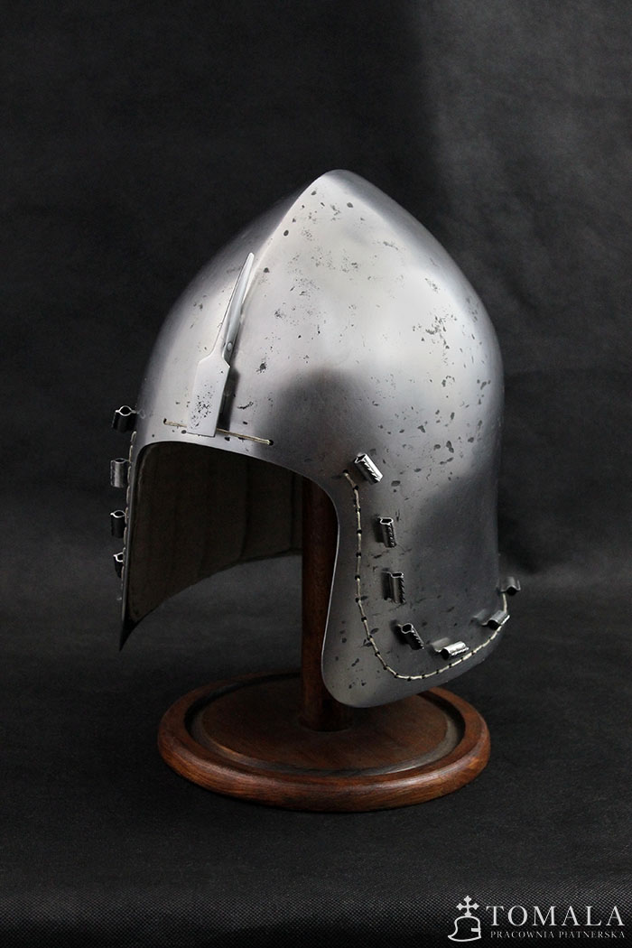 Bascinet based on original. Helmet commonly used in 14th century. Bowl is made of one piece of steel 2,5mm thick. Product is non-welded. Surface is hammered and sanded, there are hammer markings left (*6).