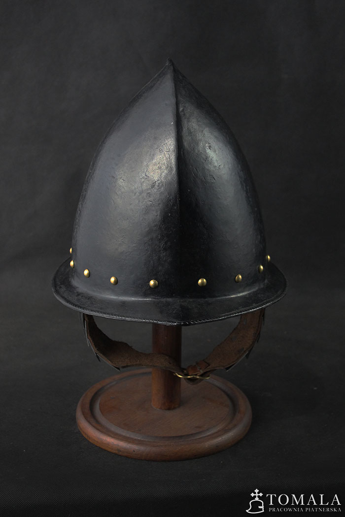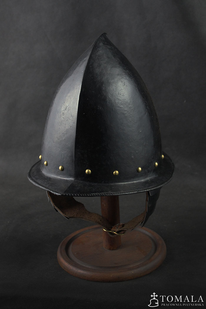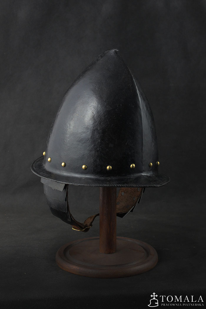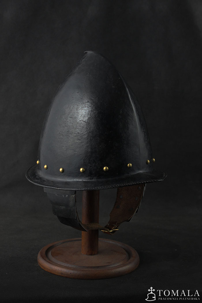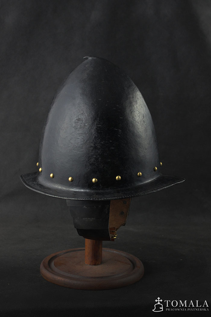 Cabasset, infantry helmet, 17th century, widespread through the whole of Europe. Price applies to helmet in default version, without cheek covers, feather casing and with ordinary steel rivets. Steel cheeks costs additionally 60 euro. Feather casing 18 euro. Additionally steel rivets can be replaced with brass rosetts (3 euro for one). Bowl is welded of two halves, steel sheet 1,5mm thick. Surface – hammered, blackened with a beeswax (*5).