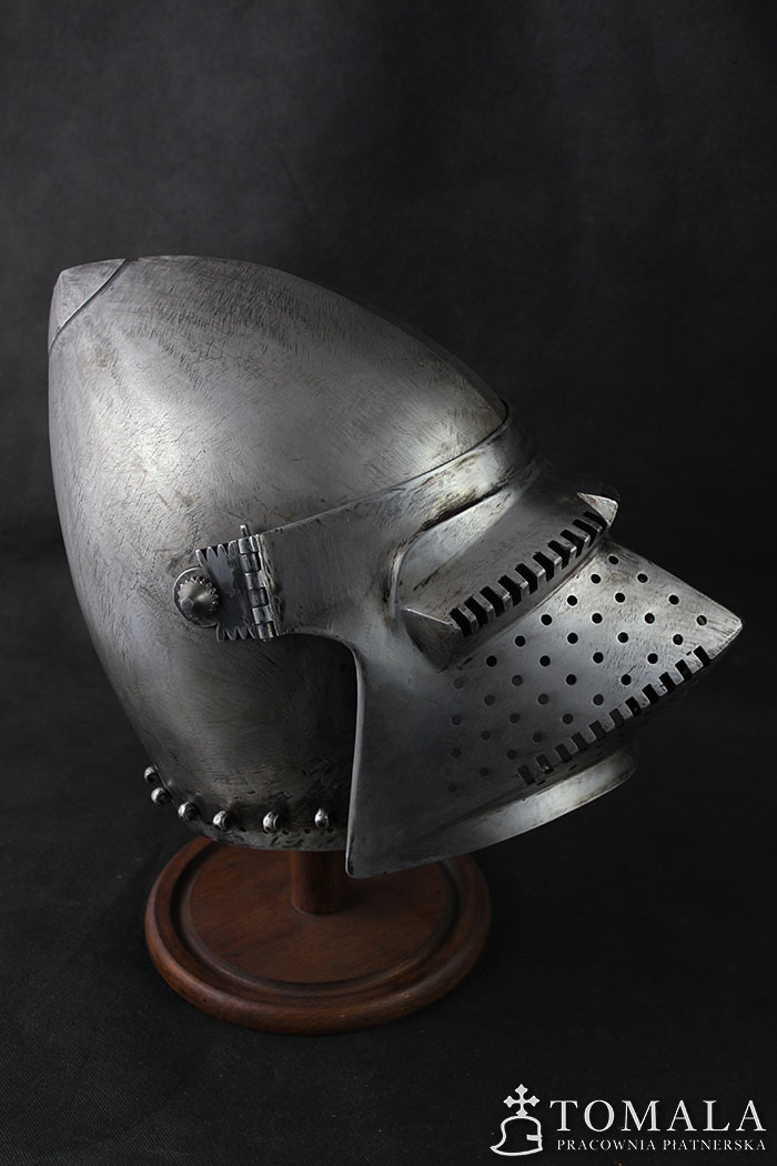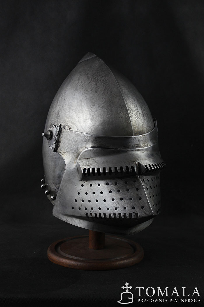 Bassinet based on preserved historical pieces. Used between late 14th and early 15th centuries. Helmet made out of one piece of steel 2,5mm, visor made out of 2,0mm steel. Surface is hammered, sanded, hammer marks left (*6) + file marks. Product is not welded.