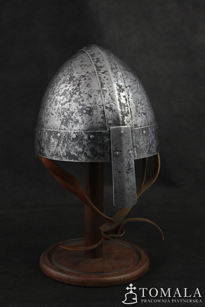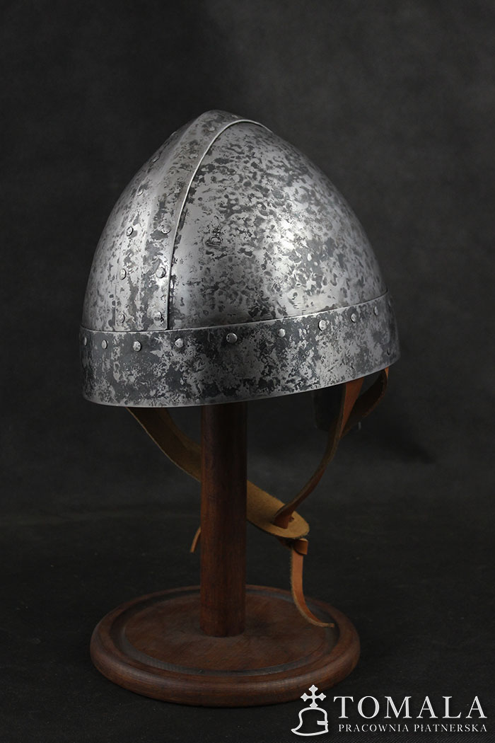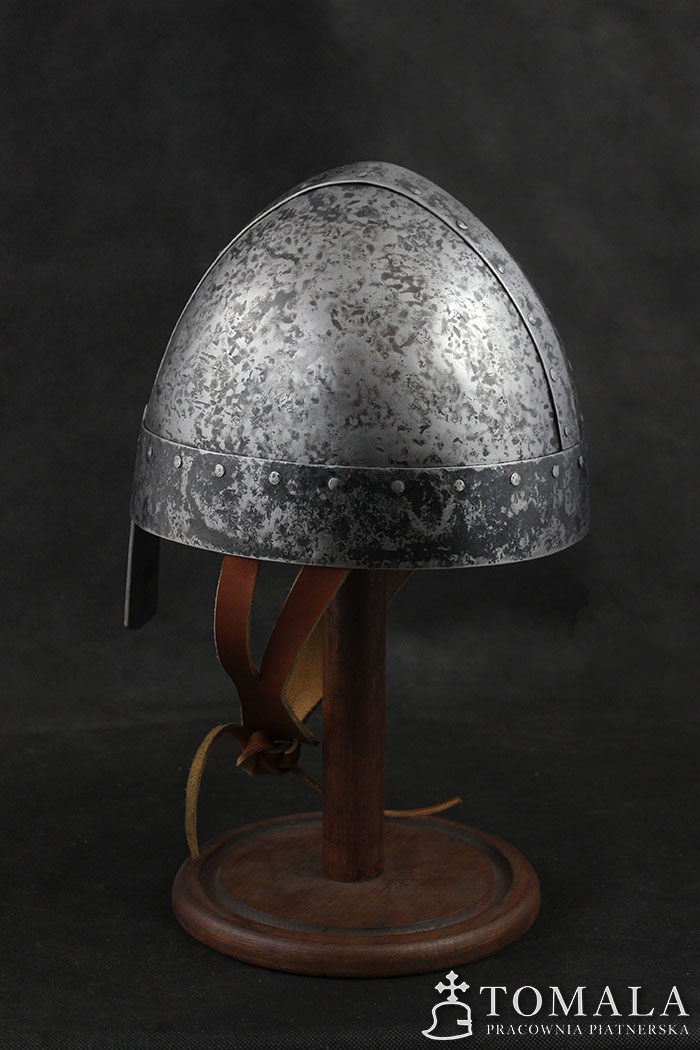 Similar helmets are known from preserved originals from 8th century. Basing on iconography one can assume that this type was used in even much later times as quite simple helmet used by not so wealthy ones. 2,0mm and 1,5mm thick steel. Hammered surface (*4). Product is non-welded.