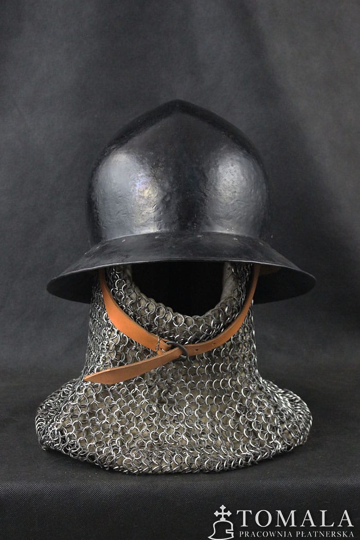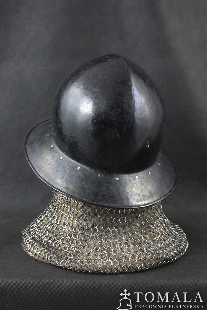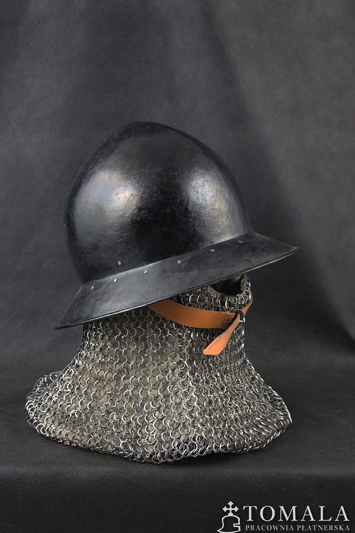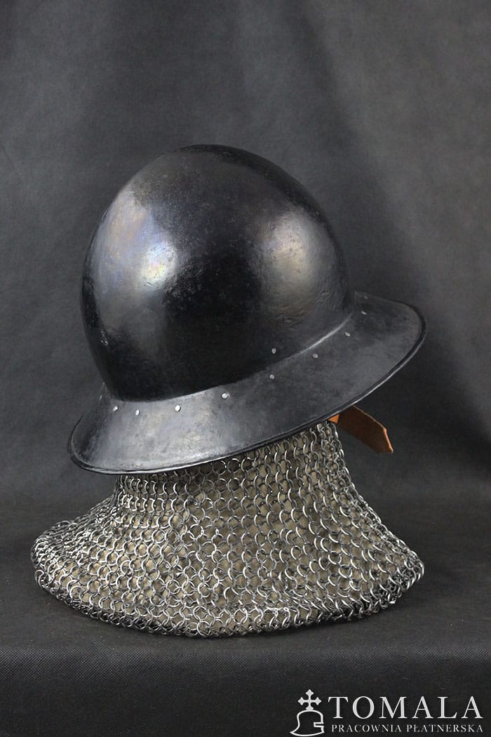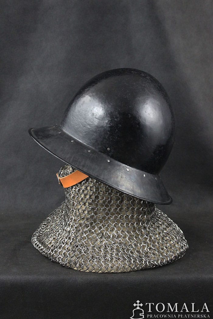 The kettle helmet made on the basis of a preserved artifact from the turn of the 14th/15th century, the original is exhibited in a museum in Germany. Welded version. Steel sheet of 2,0mm and 1,5mm (brim) thickness. On request, I can make this pattern without welding (helmet made of one piece of steel). Surface is hammered and blackened with a beeswax (*5).