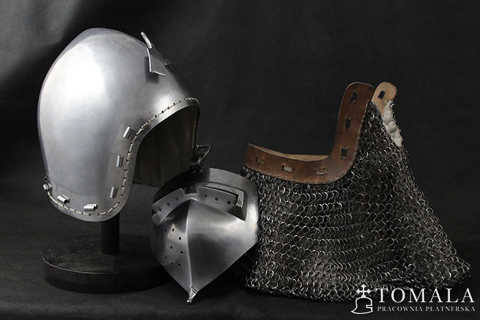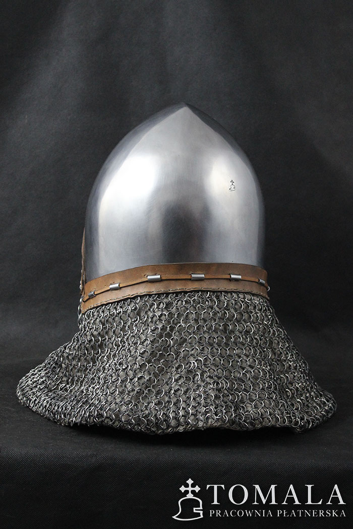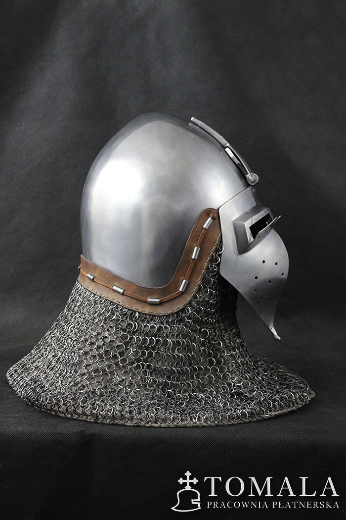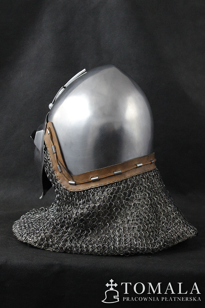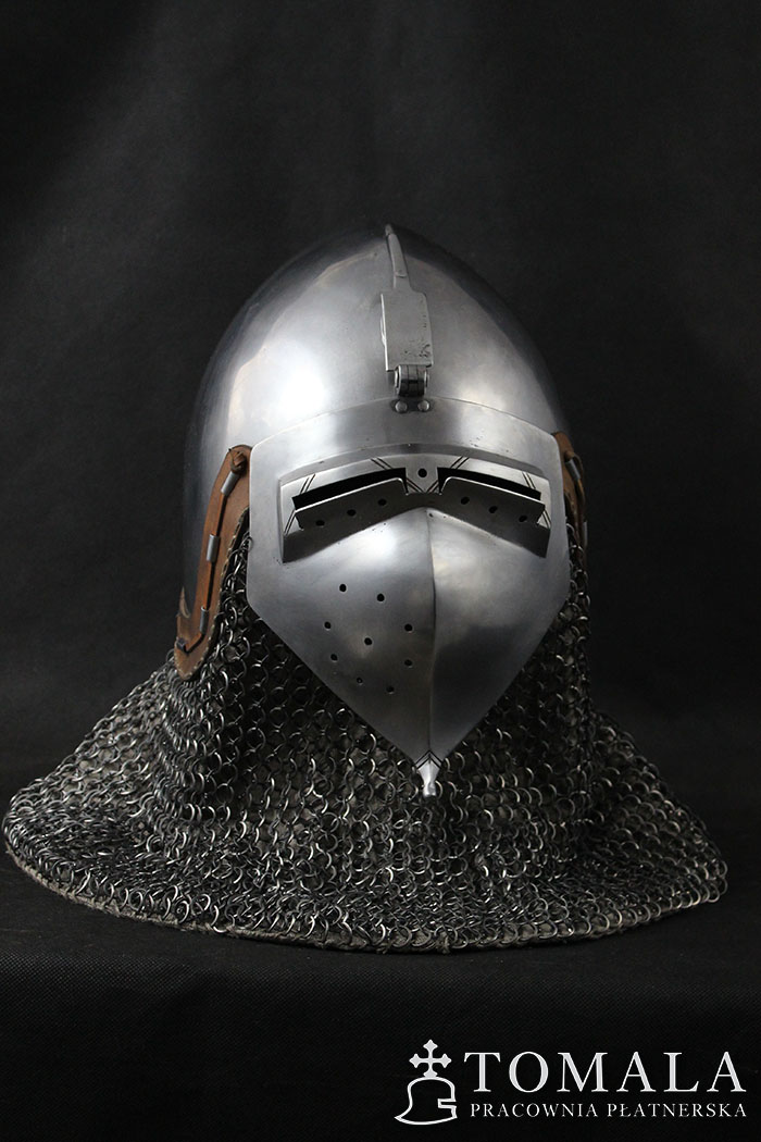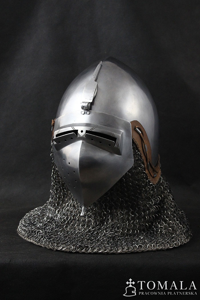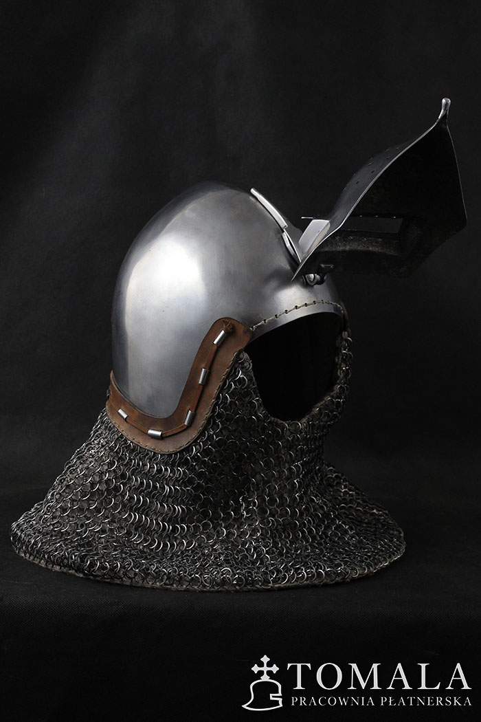 Bascinet with a visor (klappenvisier) based on original dated on 1360 year. Original is in Sitten, Switzerland. Helmet commonly used in 14th century. Bowl is made of one piece of steel 2,5mm thick. Product is non-welded.The whole is hammered, and then sanded and polished by hand (*2).