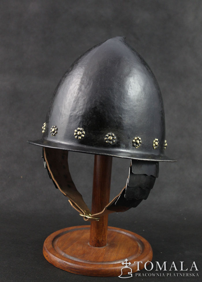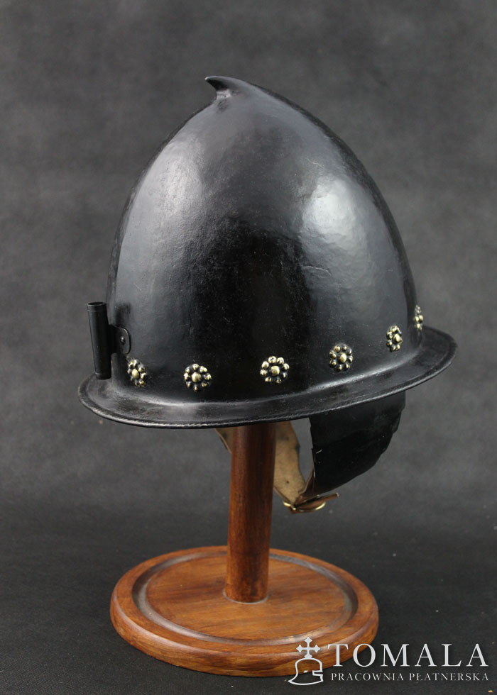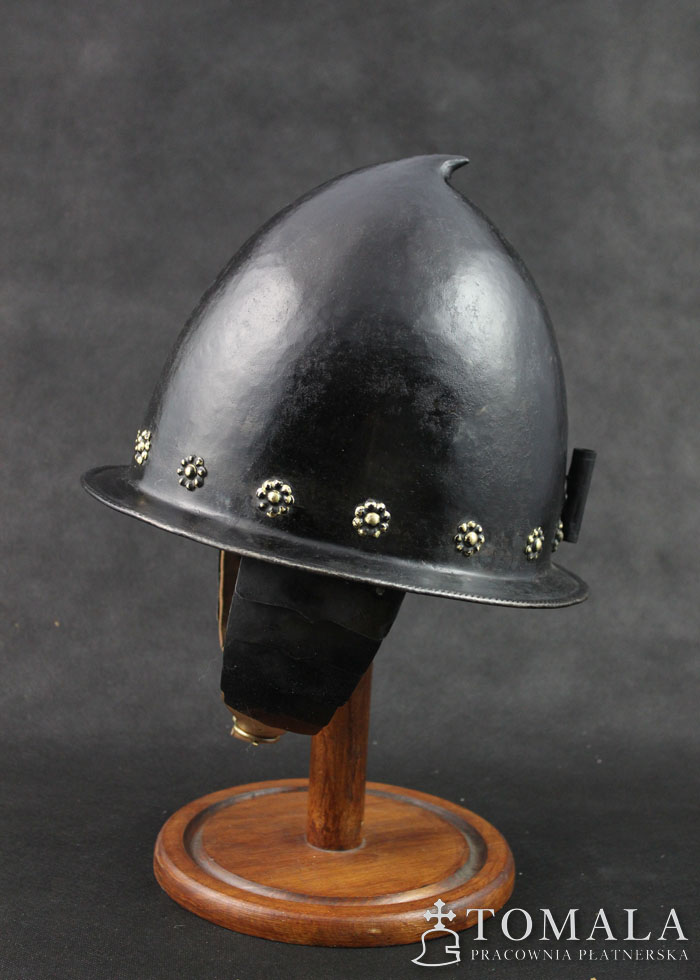 Cabasset, infantryman helmet from 17th century. This is price for its basic version – without cheeks covers, tube for feathers, and with the ordinary steel rivets. Steel covers for cheeks costs 60 euro, fixing for feathers – 18 euro. I can also replace steel rivets by brass rosettes for 3 euro per each. This helmet is welded in 2 parts, made of 1,5mm steel. Surface – hammered, blackened with a beeswax (*5). On request, I can do this model without welding (helmet hammered from a 1 piece of steel).