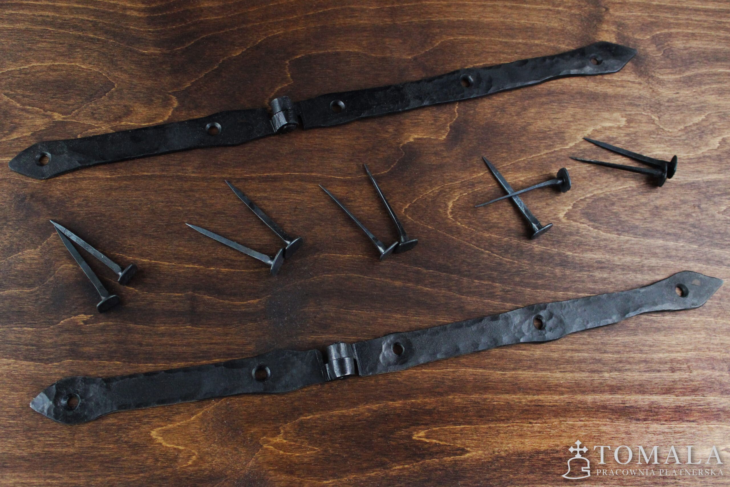 Pair of hinges. Made from 20mm wide, 4mm thick flat bar. Arm lengths are approximately 17cm and 26cm. Included are 10 nails (6.5cm long). Everything is hand-forged.