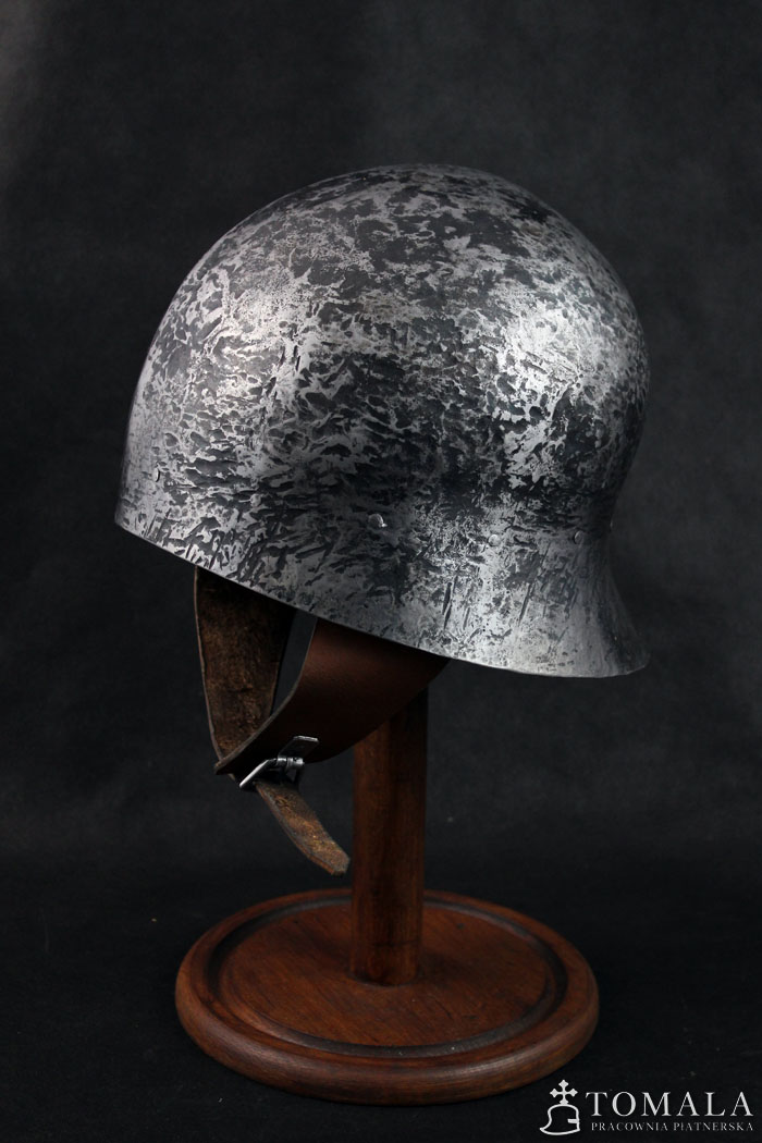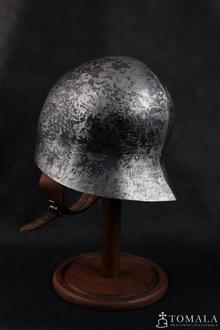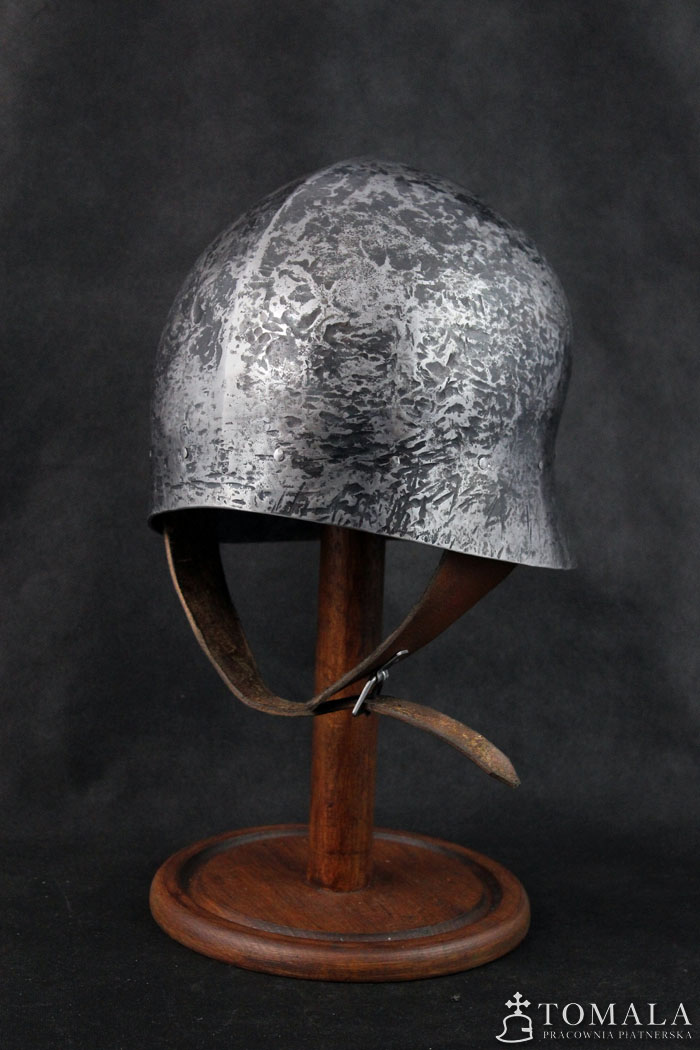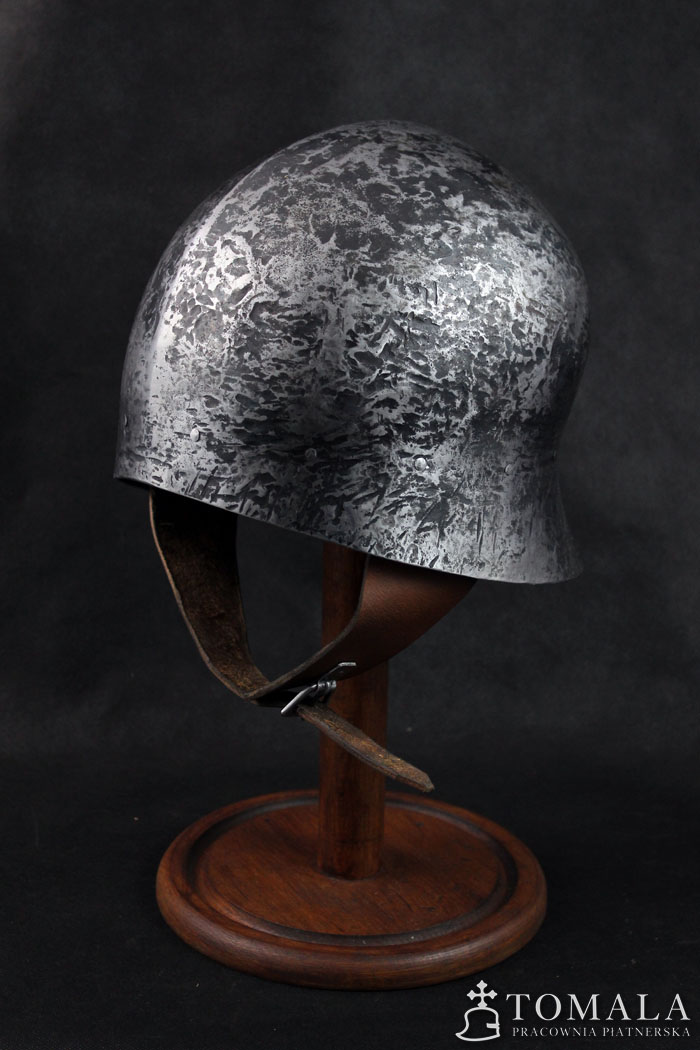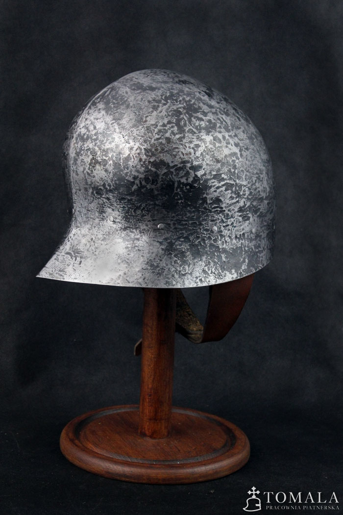 Hełm kuty z jednego kawałka stali, materiał wyjściowy to blacha grubości 2,0mm. Używany w XV wieku, głównie przez piechotę. Popularny w całej Europie. Powierzchnia kuta (*4). Produkt nie jest spawany.