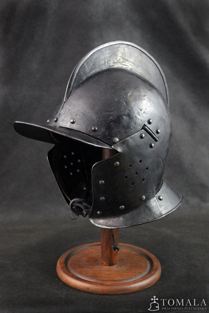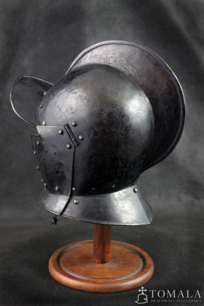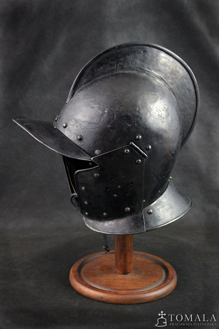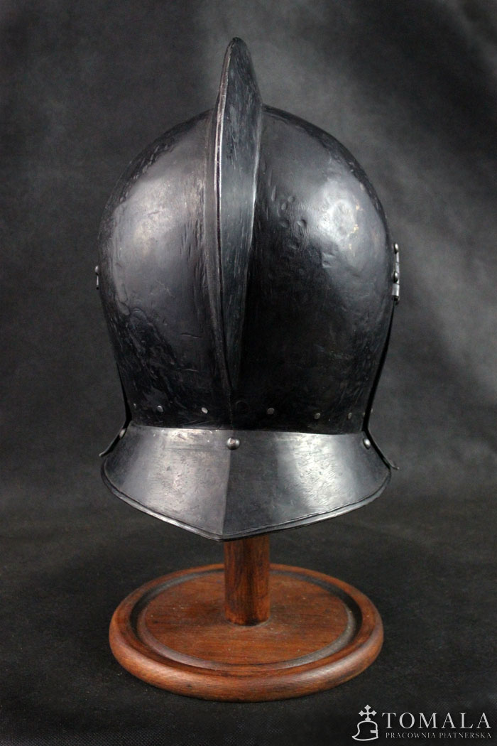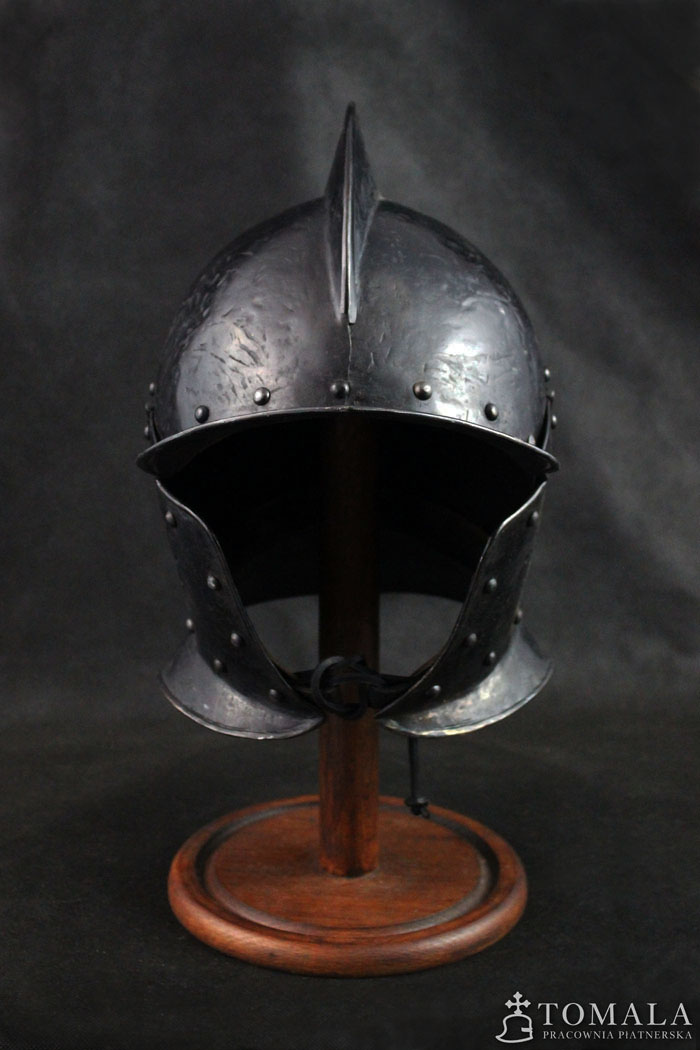 Burgonetka, pierwsza połowa XVII wieku. Wykonana na podstawie zachowanego oryginału. Hełm wykonany z sześciu kawałków blachy, jak w oryginale. Produkt nie jest spawany. Blacha 2mm oraz 1,5mm. Powierzchnia kuta, czerniona woskiem pszczelim (*5).