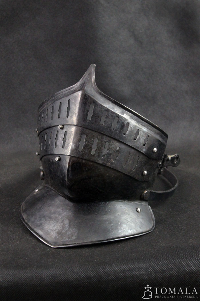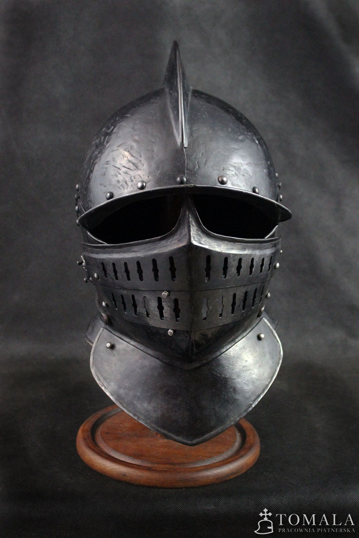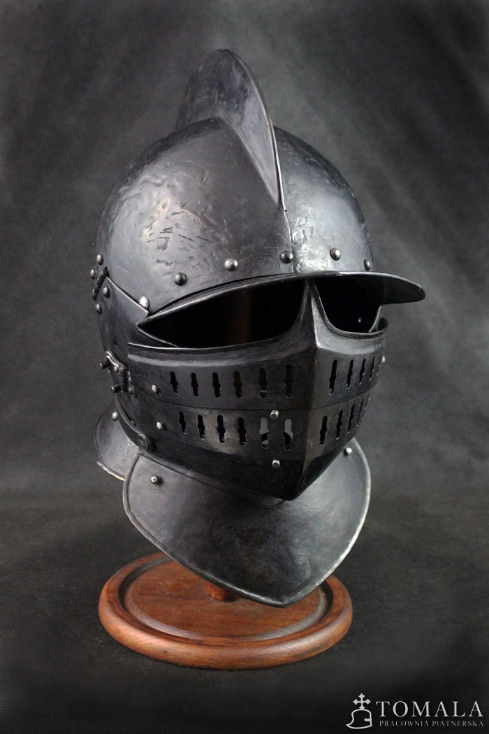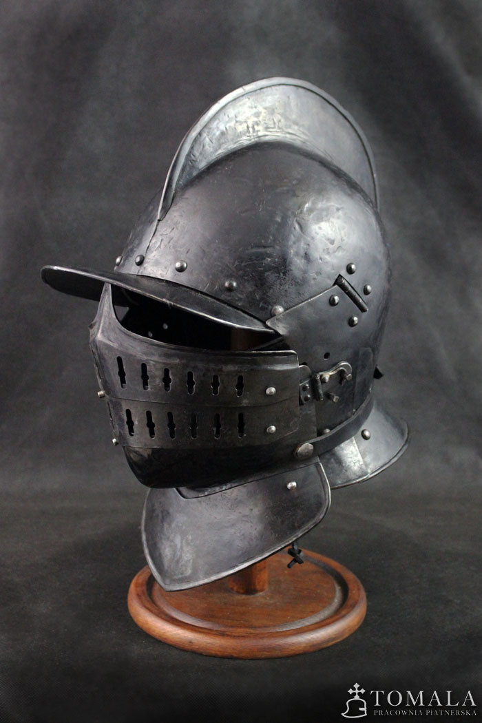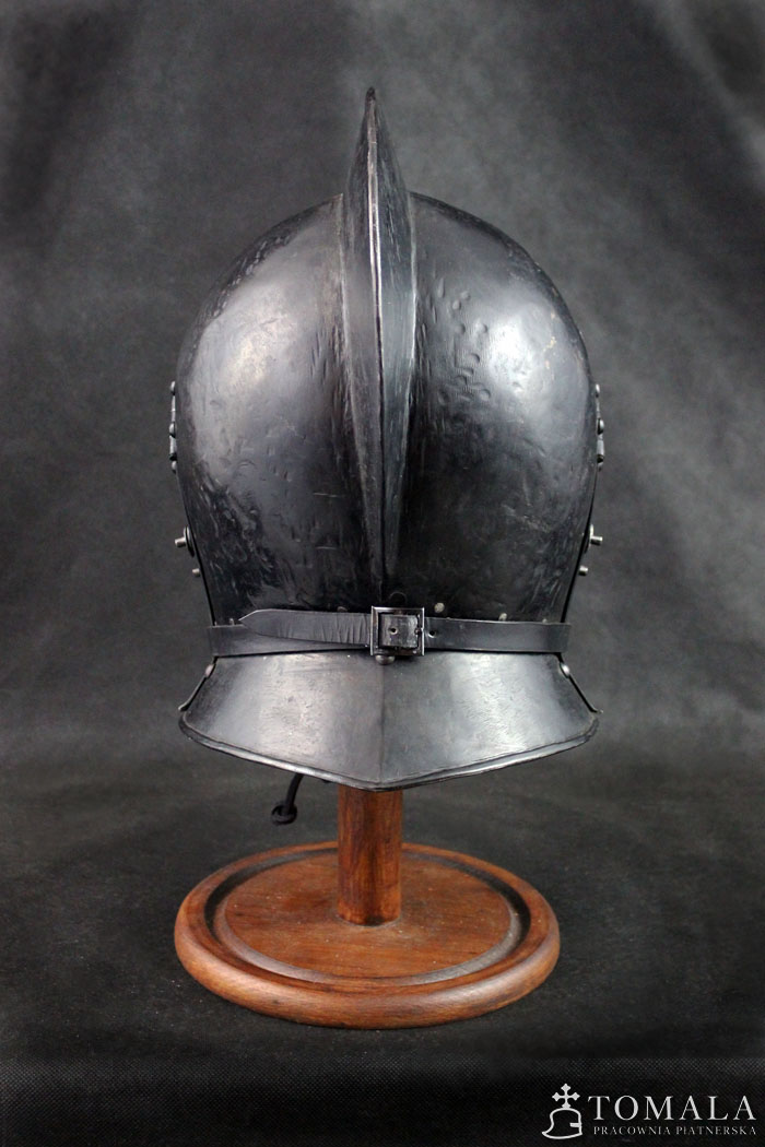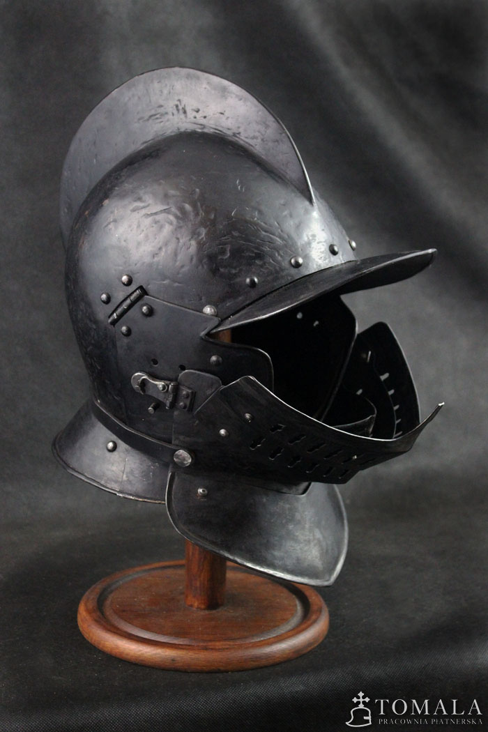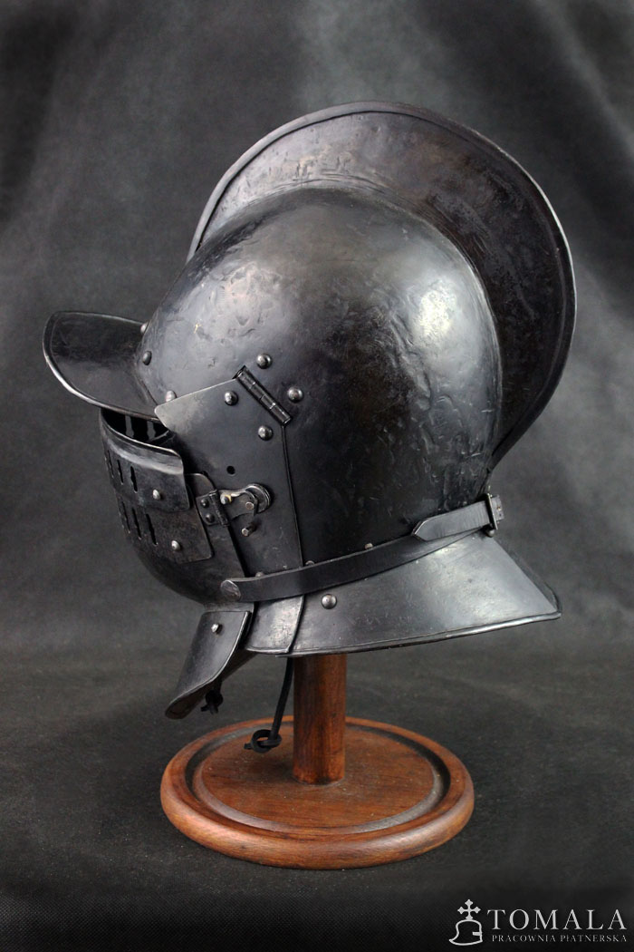 Burgonetka, pierwsza połowa XVII wieku. Wykonana na podstawie zachowanego oryginału. Hełm wykonany z sześciu kawałków blachy, jak w oryginale. Produkt nie jest spawany. Blacha 2mm oraz 1,5mm. Hełm dodatkowo wyposażony jest w segmentową zasłonę twarzy. Wzorowana na zabytkach. Powierzchnia kuta, czerniona woskiem pszczelim (*5).