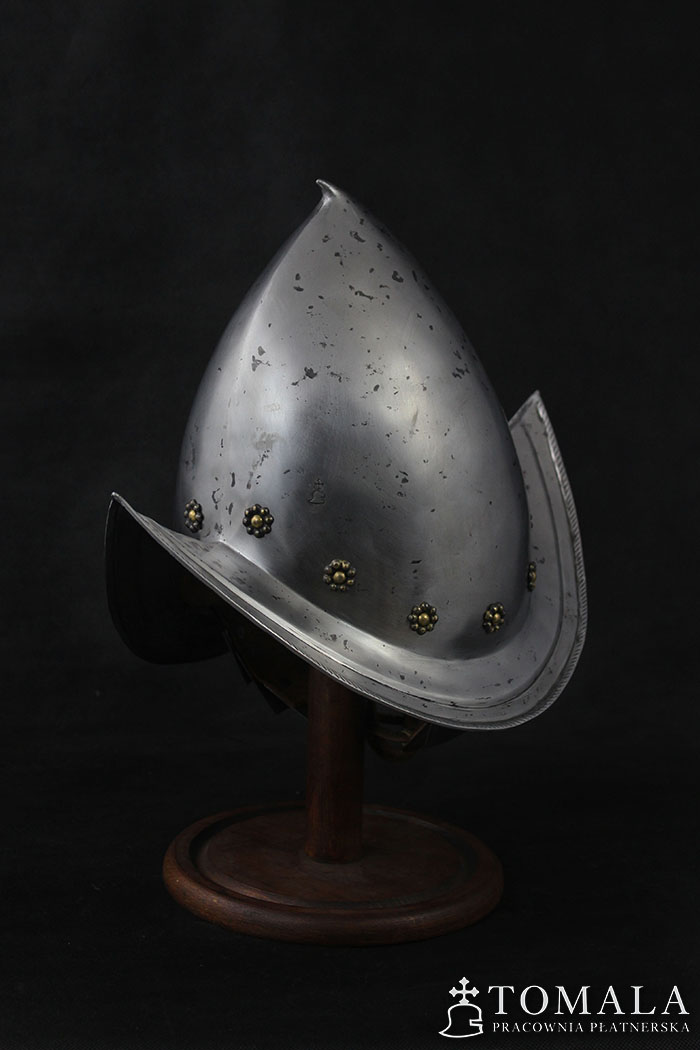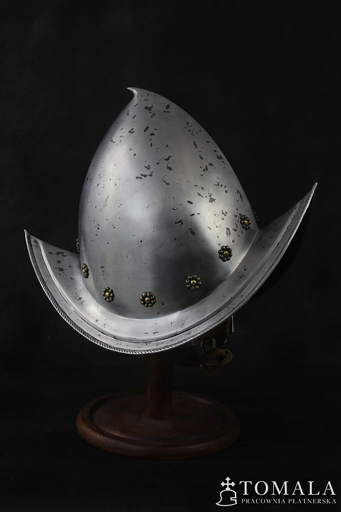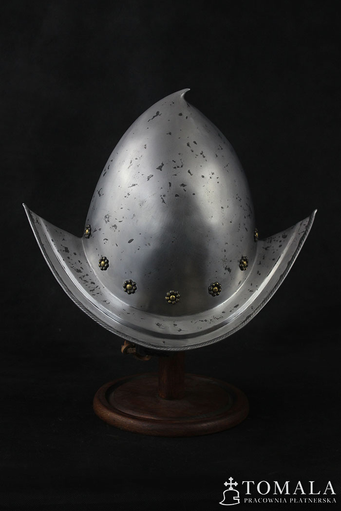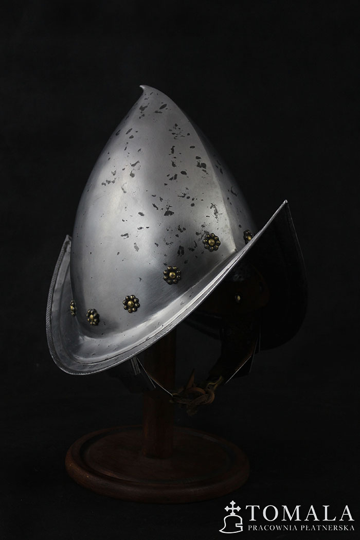 Morion, hełm piechoty, XVII wiek, rozpowszechniony w całej Europie. Cena odnosi się do hełmu w wersji podstawowej, czyli bez metalowej osłony policzków, tulejki na pióra oraz ze zwykłymi stalowymi nitami. Stalowe policzki kosztują dodatkowo 240 zł. Mocowanie na pióra 70 zł. Dodatkowo stalowe nity mogą być zastąpione mosiężnymi rozetkami (12 zł sztuka). Dzwon zespawany z dwóch połówek, blacha 1,5 mm. Powierzchnia kuta, szlifowana, pozostawione ślady po kuciu (6*).