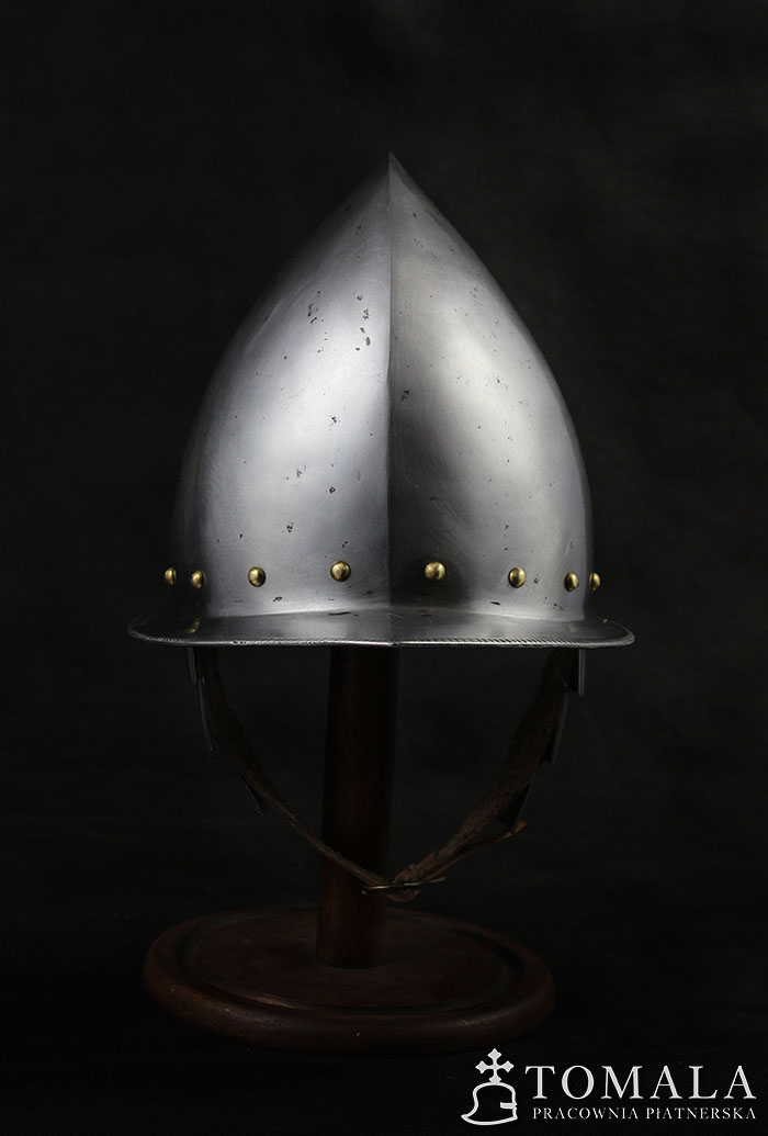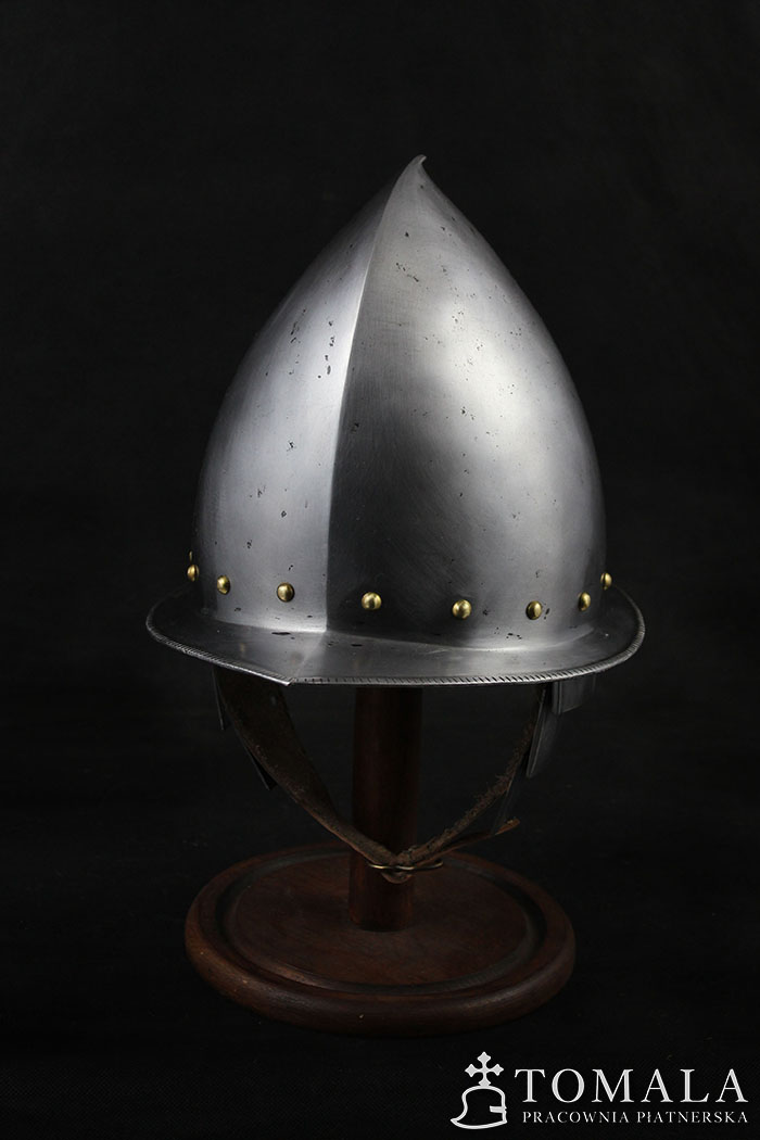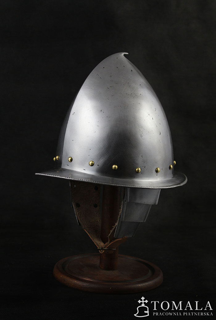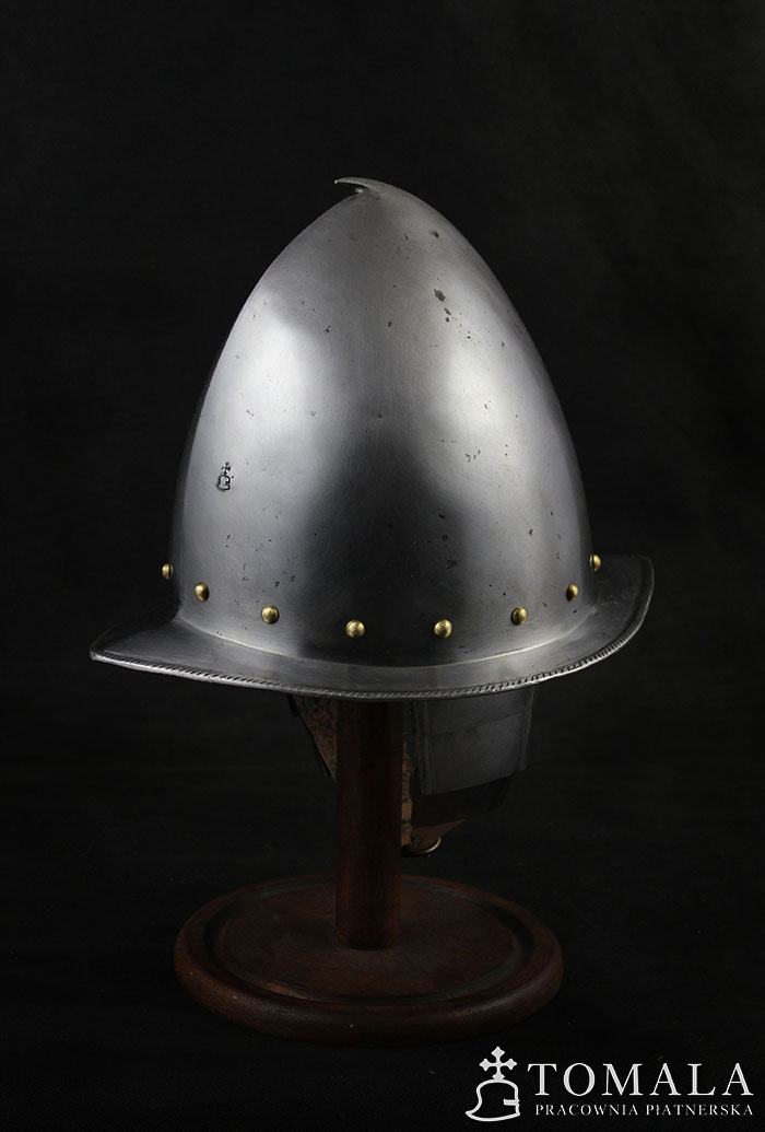Cabasset, hełm piechoty, XVII wiek, rozpowszechniony w całej Europie. Cena odnosi się do hełmu w wersji podstawowej, czyli bez metalowej osłony policzków, tulejki na pióra oraz ze zwykłymi stalowymi nitami. Stalowe policzki kosztują dodatkowo 240 zł. Mocowanie na pióra 70 zł. Dodatkowo stalowe nity mogą być zastąpione mosiężnymi rozetkami (12 zł sztuka). Dzwon spawany, blacha 1,5mm. Powierzchnia kuta, szlifowana, pozostawione ślady po kuciu (6*).