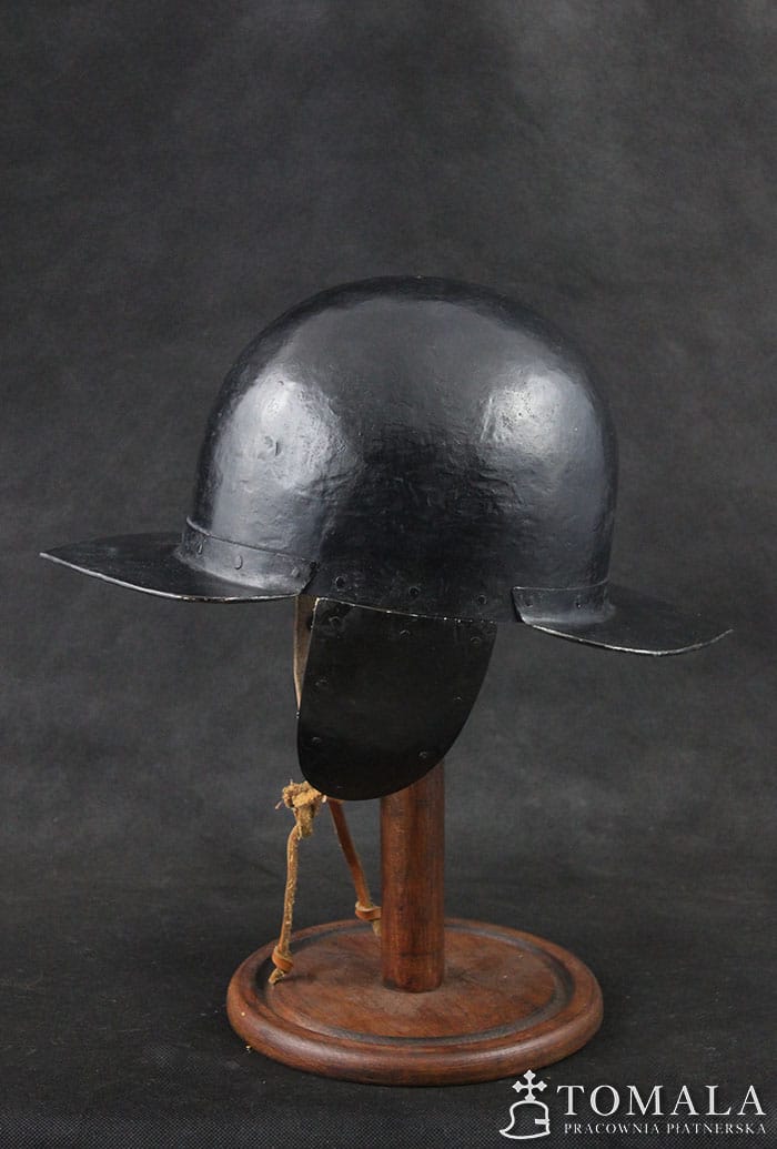 Hełm saperski, połowa XVII wieku. Ten hełm był noszony przez żołnierzy (saperów, inżynierów) pracujących pod murami fortyfikacji podczas oblężeń, tam gdzie byli narażeni na intensywny ostrzał. Hełm był używany w komplecie z prostym, ale grubym napierśnikiem. Dzwon wykuty z jednego kawałka blachy 2mm, policzki i daszek 1,5mm. Powierzchnia kuta, czerniona woskiem pszczelim (*5). Produkt nie jest spawany.