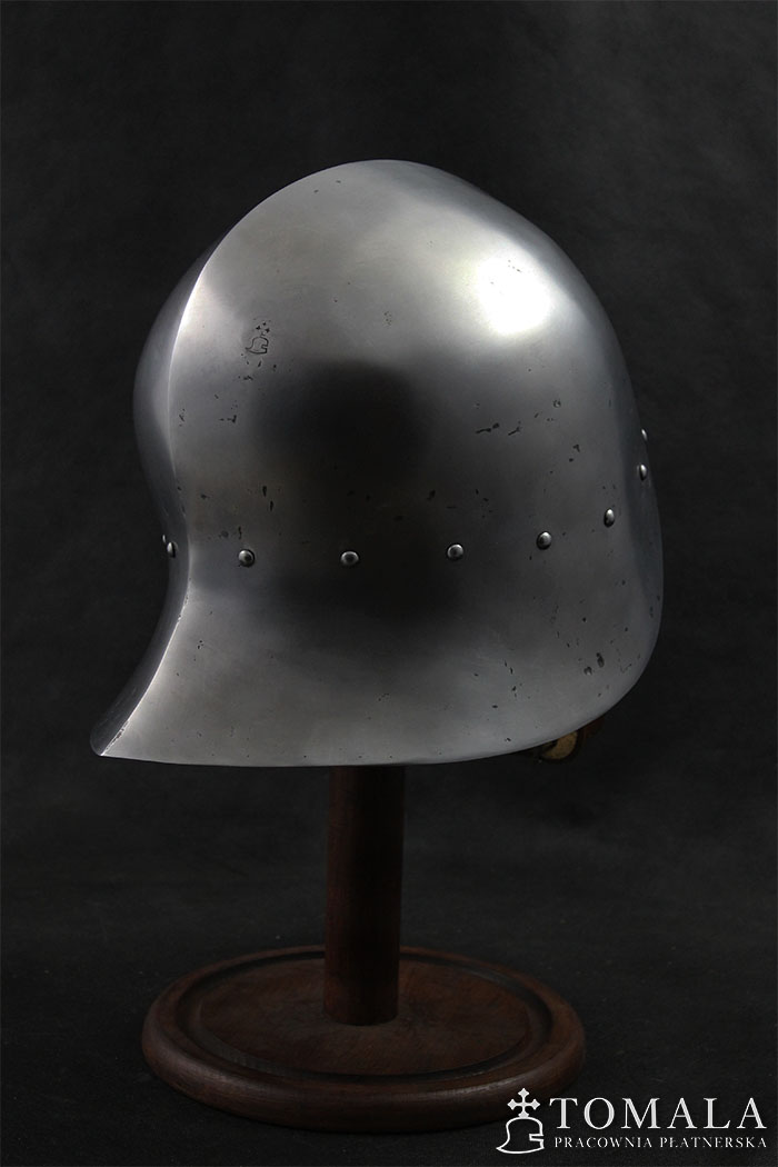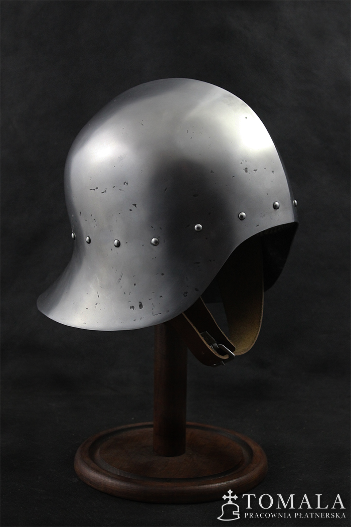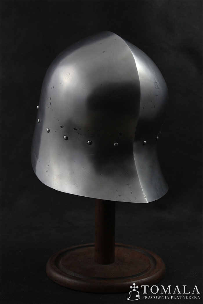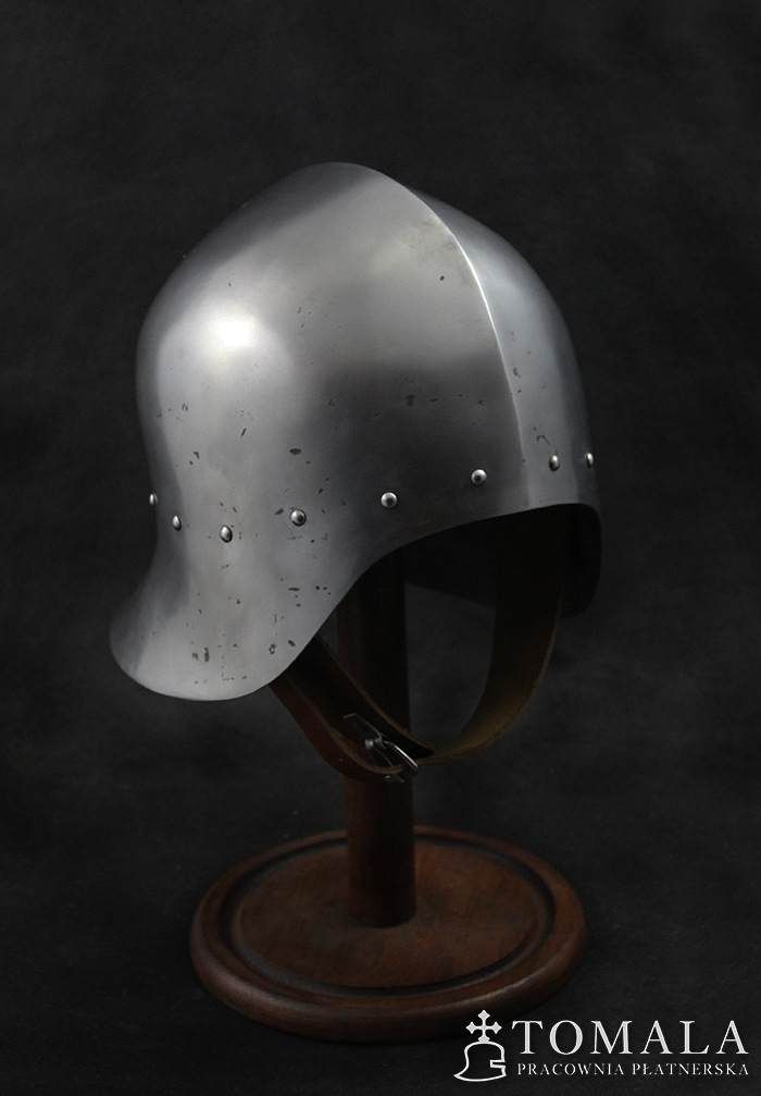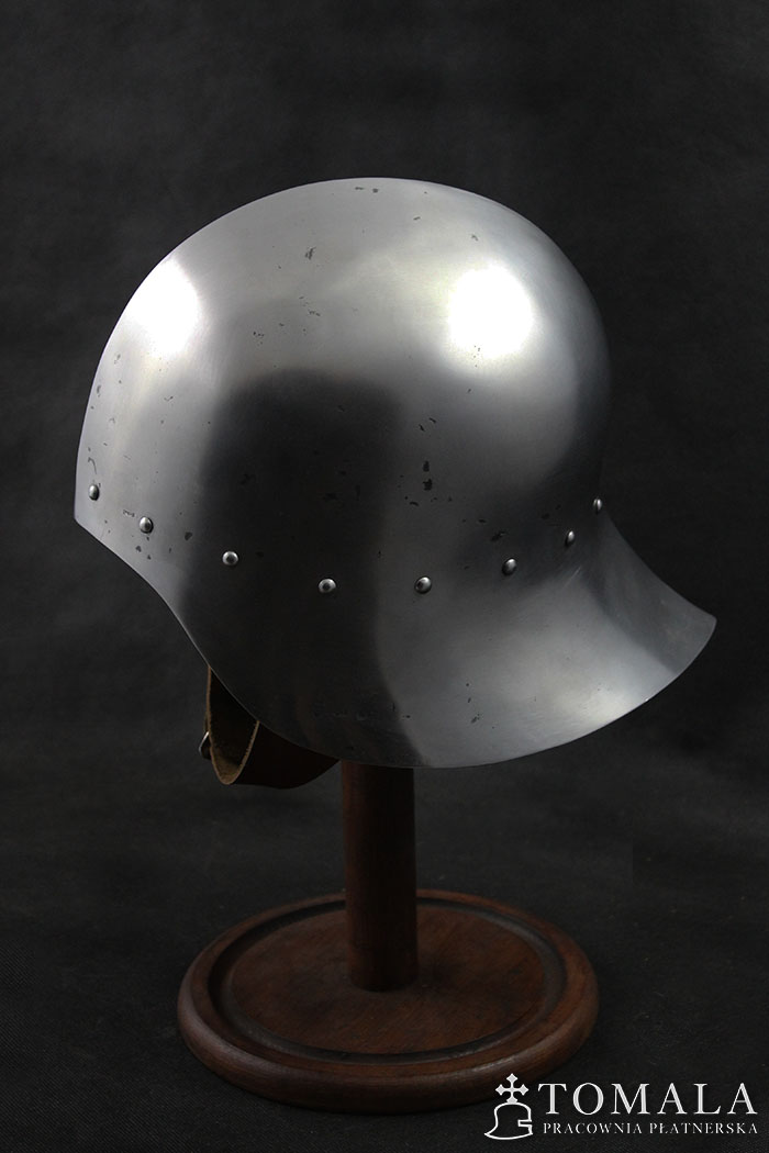 Hełm kuty z jednego kawałka stali, materiał wyjściowy to blacha grubości 2,0mm. Używany w XV wieku głównie przez piechotę. Popularny w całej Europie. Całość jest kuta, a następnie szlifowana i ręcznie polerowana (*2). Na powierzchni są pozostawione ślady po pilniku. Produkt nie jest spawany.