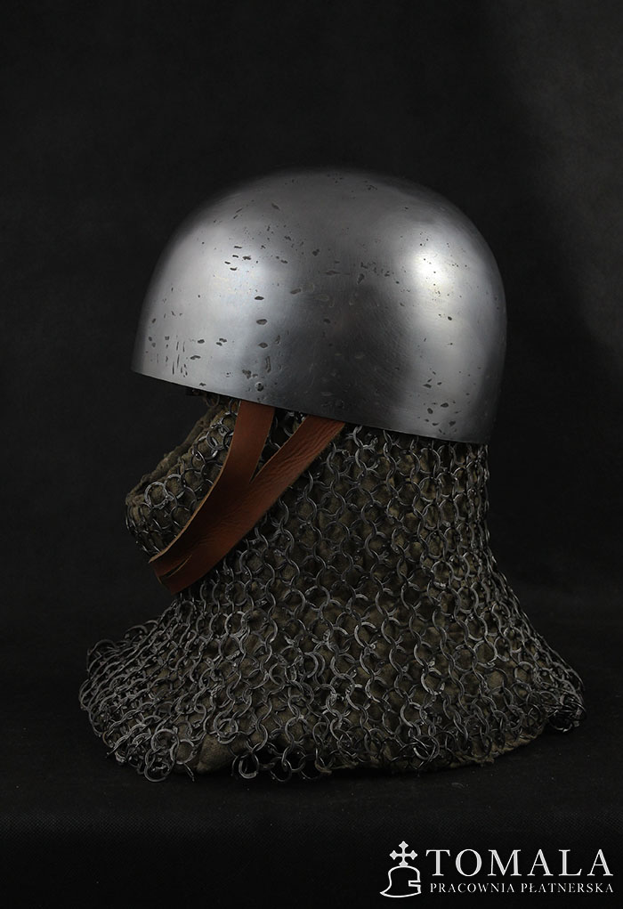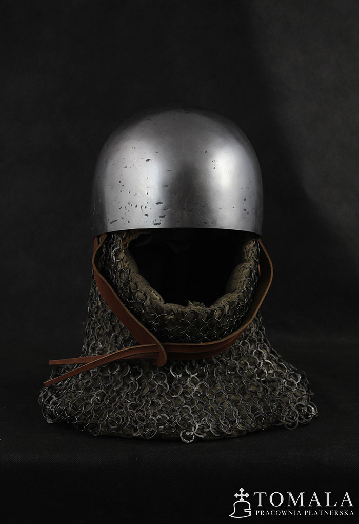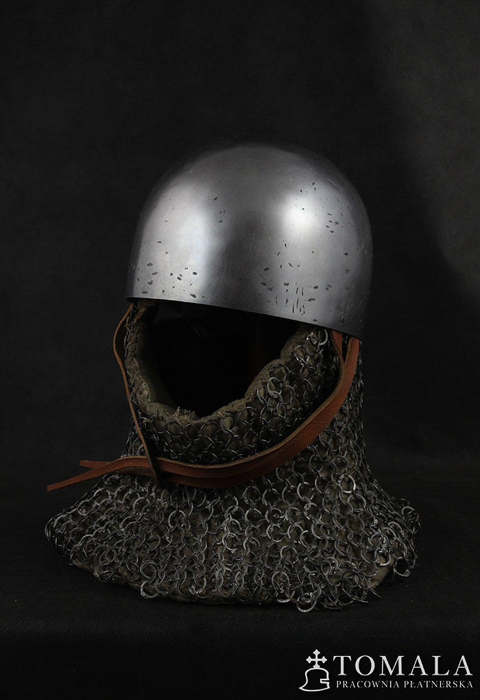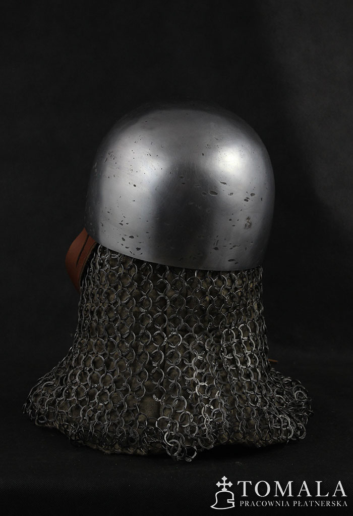 Hełm kuty z jednego kawałka stali grubości 2mm. Stosowany w podobnej formie od XIII do XVII w. Początkowo takie hełmy były stosowane przez rycerstwo jako dodatkowy hełm (hełm sekretny). W XV wieku rozpowszechnił się jako hełm lekko zbrojnych żołnierzy. W XVII wieku był używany sporadycznie, czasem przykrywany kapeluszem. Hełmy takie zachowały się jako oryginały oraz występują w ikonografii z różnych wieków. Powierzchnia kuta, szlifowana, pozostawione ślady po kuciu (*6). Produkt nie jest spawany.