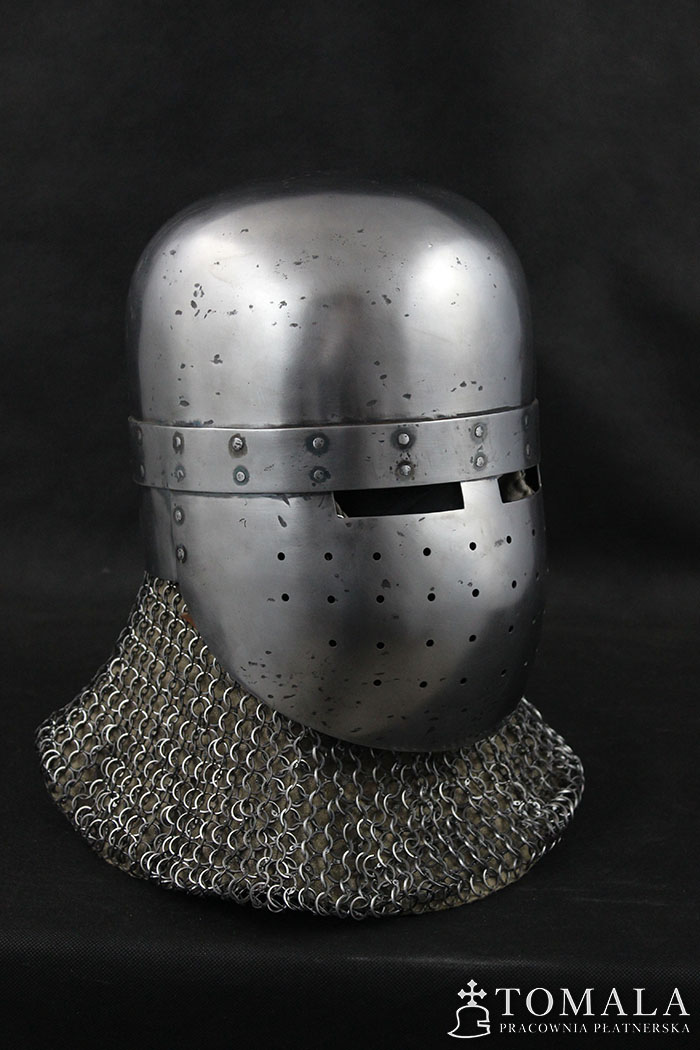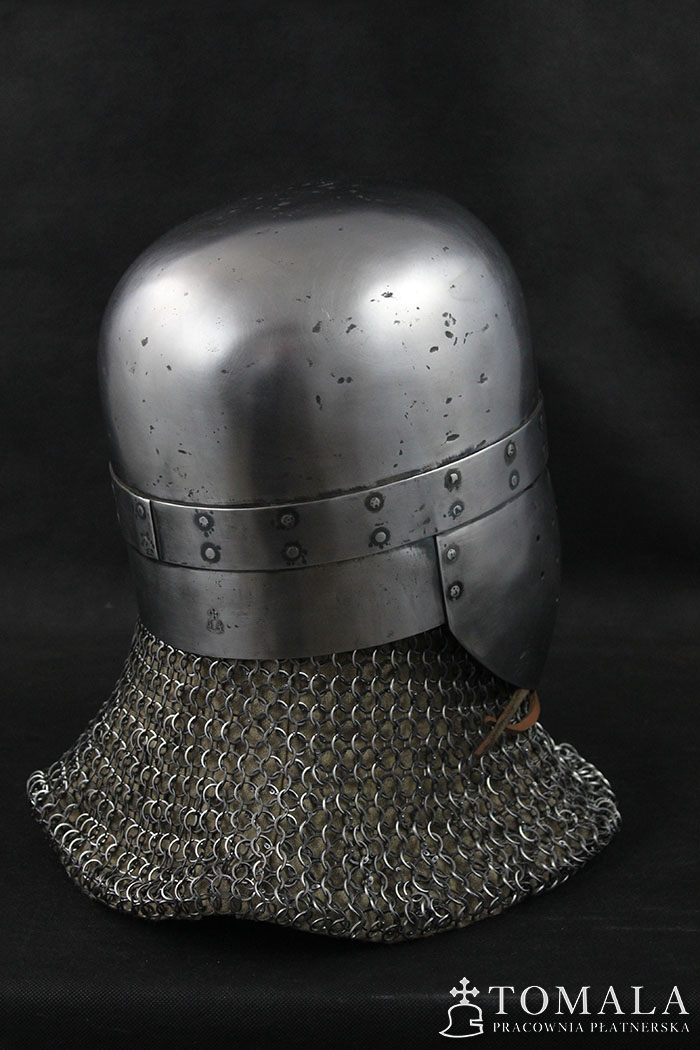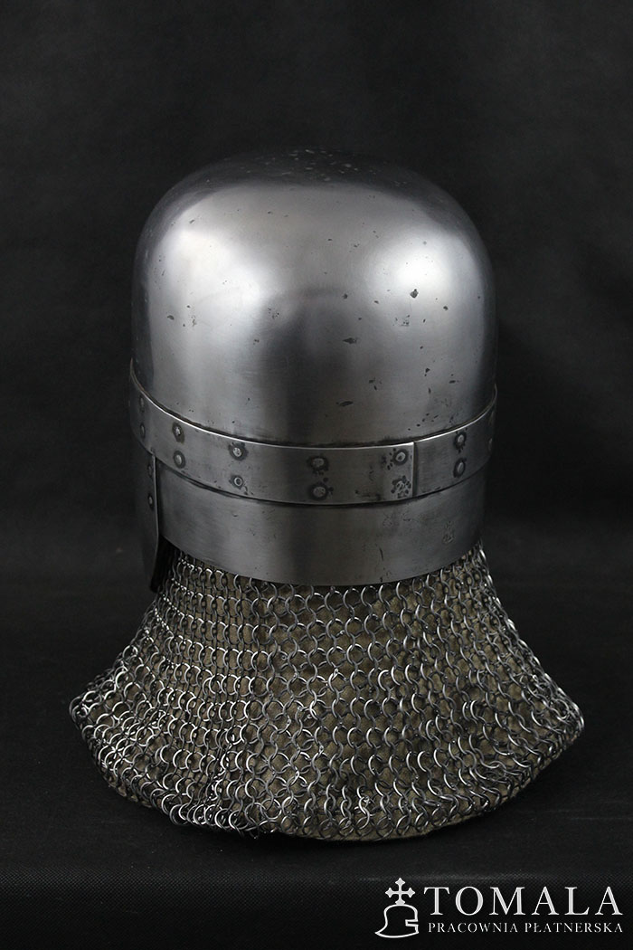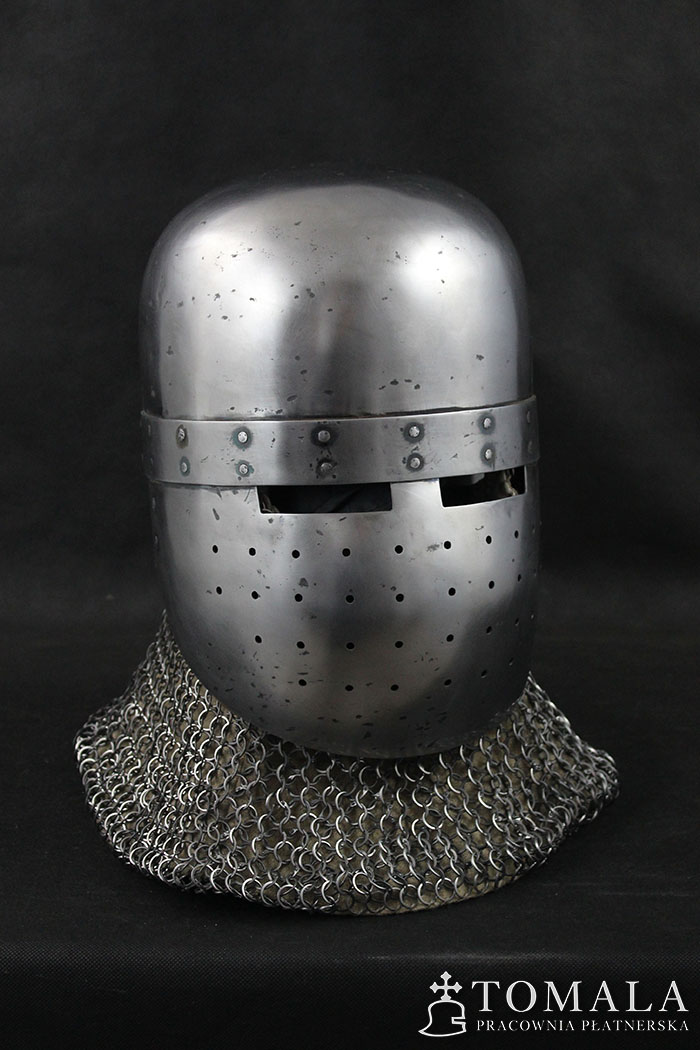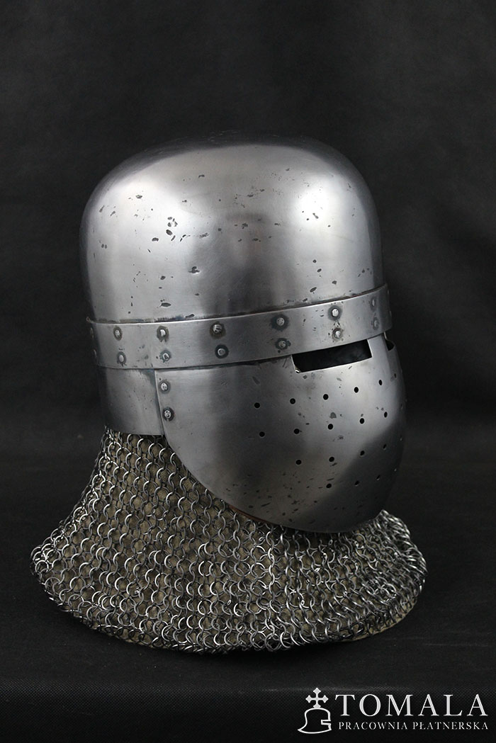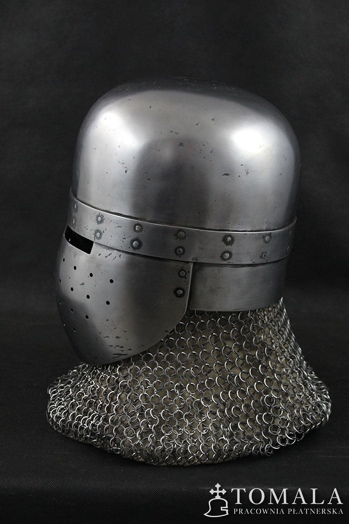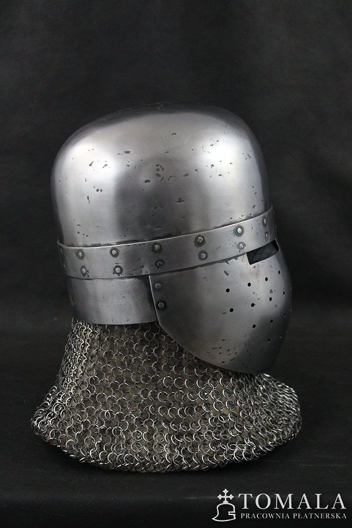 Hełm garnczkowy z początków XIII wieku. Dzwon wykuty z jednego kawałka stali grubości 2,5mm. Maska i nakarczek z blachy o grubości 1,5mm. Powierzchnia kuta, szlifowana, pozostawione ślady po kuciu (6*). Produkt nie jest spawany.