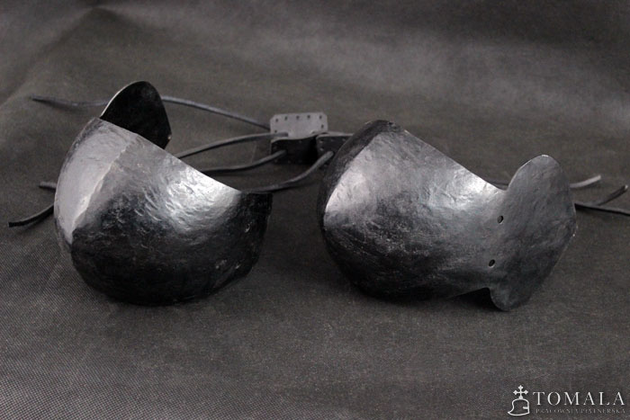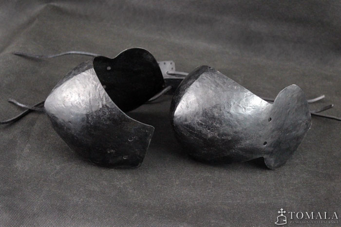 Osłona łokcia spotykana w ikonografii z XIV wieku. Wykonana z blachy o grubości 1,5mm. Powierzchnia kuta, czerniona woskiem pszczelim (*5). Produkt nie jest spawany.