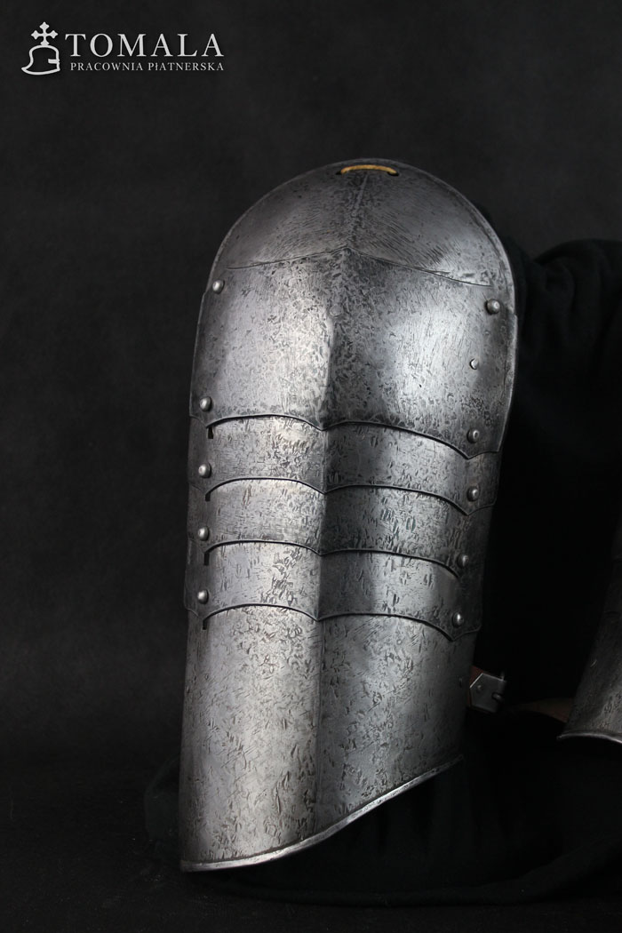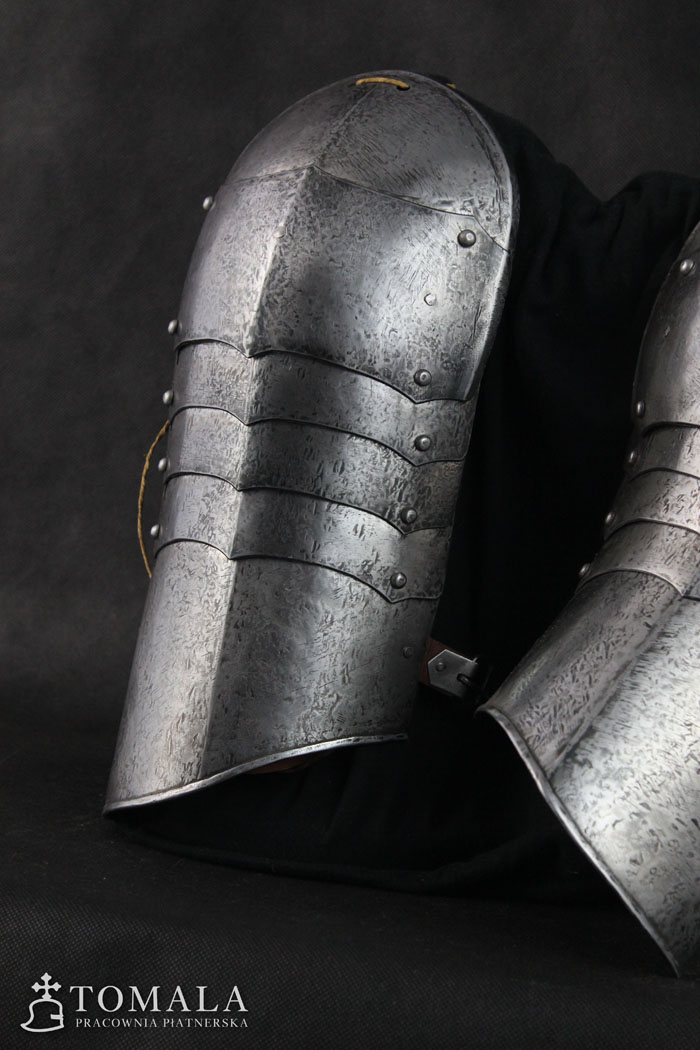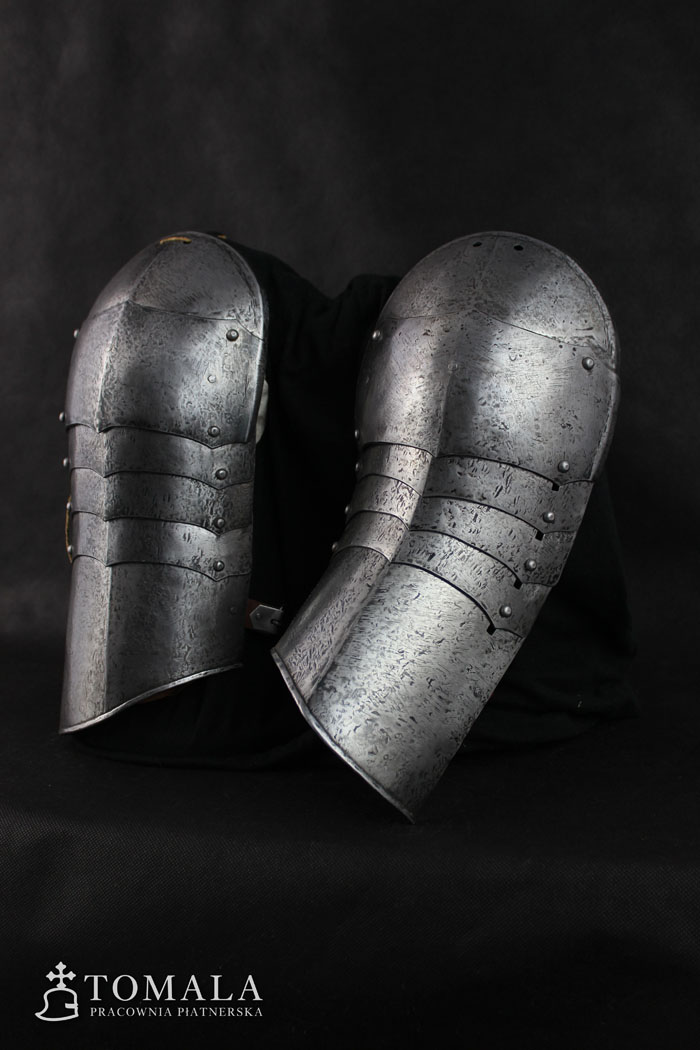 Naramienniki wykonane na podstawie zachowanego zabytku z drugiej połowy XV wieku. Blacha 1,2mm. Produkt nie jest spawany. Powierzchnia kuta, lekko szlifowana, pozostawione ślady po kuciu (*7).