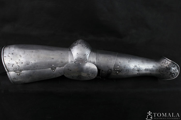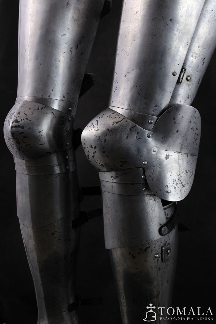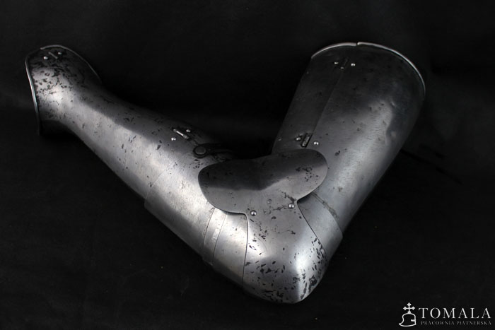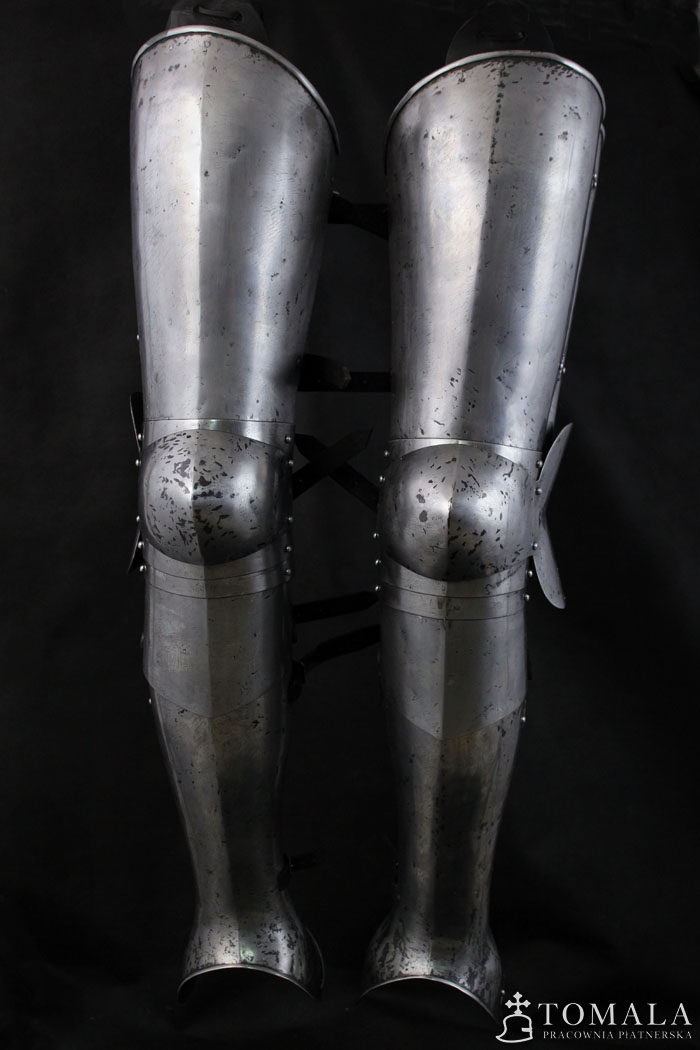 Nogi płytowe z końca XIV wieku. W komplecie z osłonami łydki. Egzemplarz na fotografii jest wykuty ze stali wyższej jakości C45 i kosztuje 14400 zł. Wykonany ze standardowej stali – 10800 zł. Blacha 1,5mm i 1mm. Powierzchnia kuta, szlifowana, pozostawione ślady po kuciu (*6), dodatkowo na powierzchni są pozostawione ślady po pilniku. Produkt nie jest spawany.