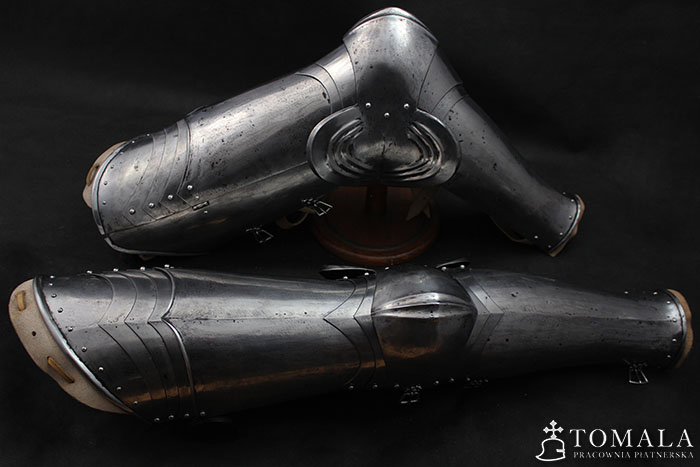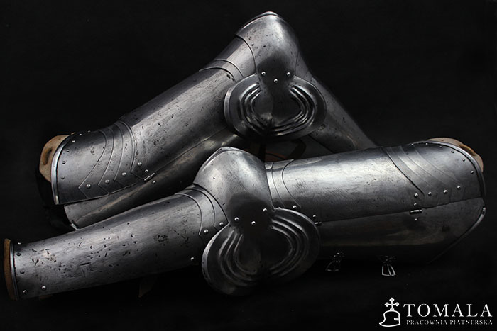 Osłona nogi wykonana w stylu gotyckim. Druga połowa XV wieku. Wykonane z blachy 1,5mm oraz 1,2mm. Powierzchnia kuta, szlifowana, pozostawione ślady po kuciu (*6) + ślady po pilniku. Produkt nie jest spawany.
