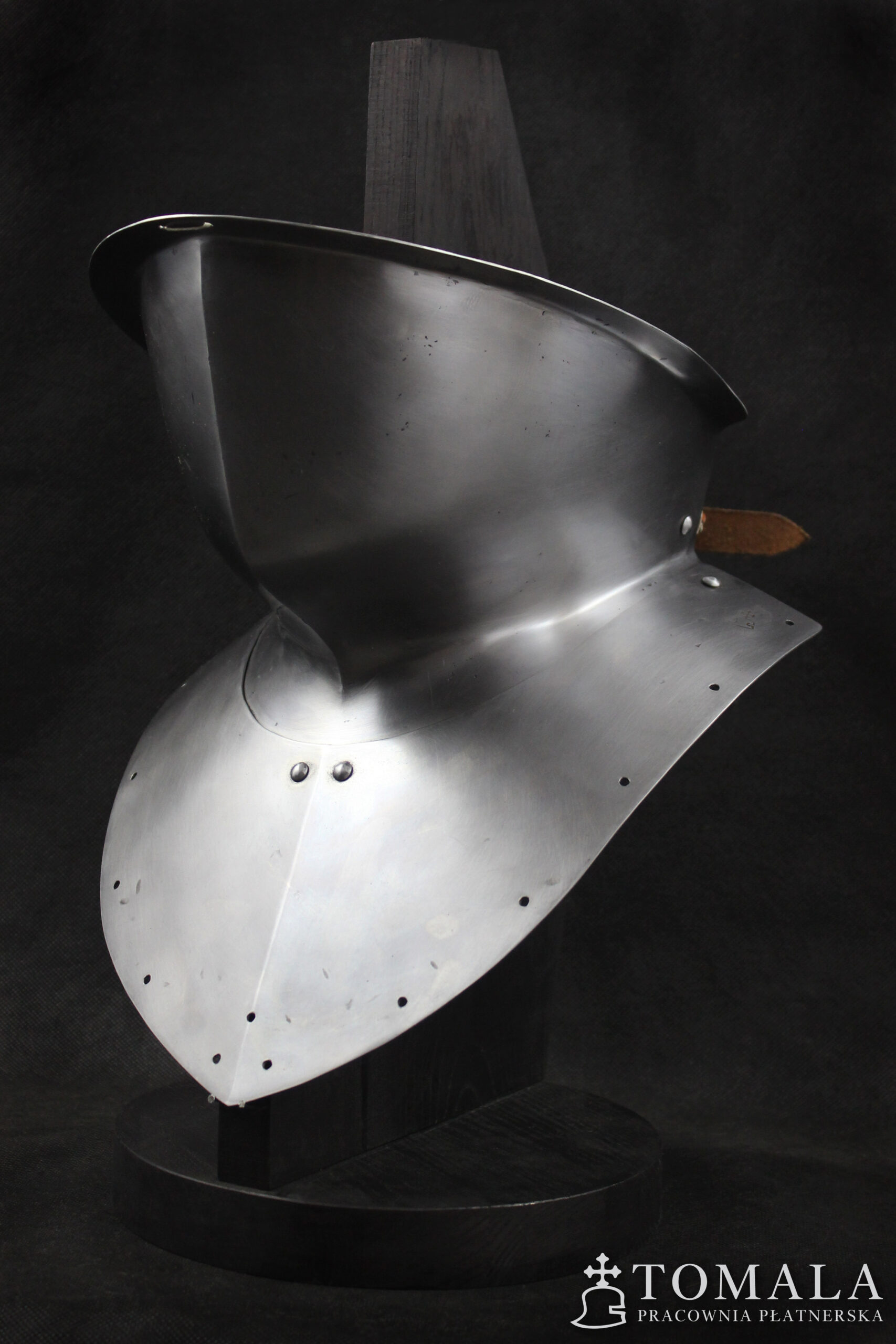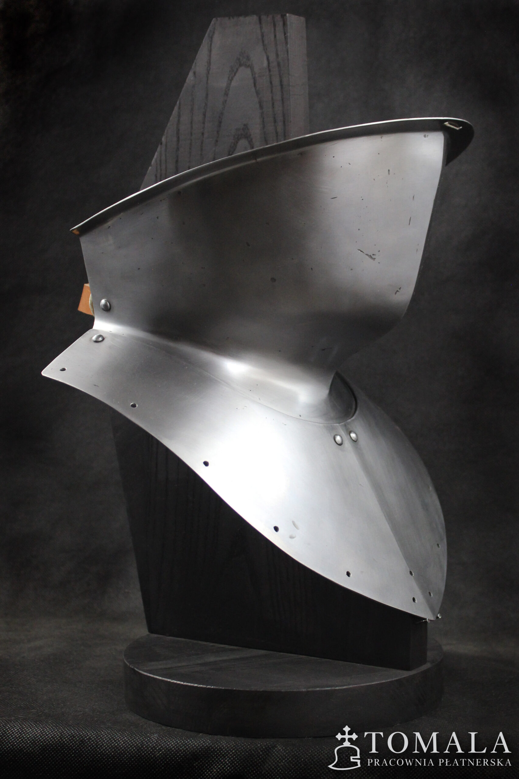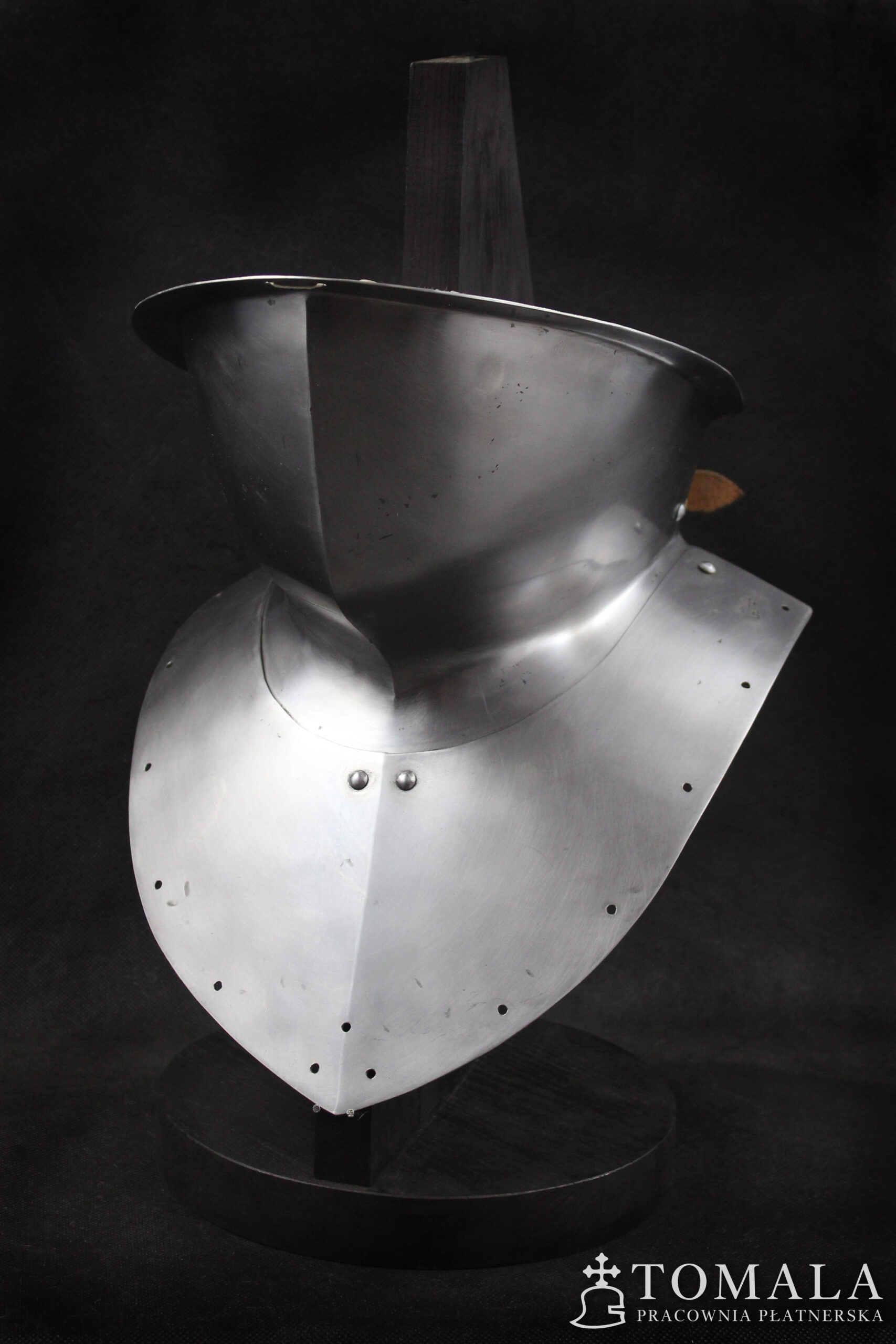 Podbródek, osłona brody. Druga połowa XV wieku. Grubość materiału 1,5 i 2,0mm. Całość jest kuta, a następnie szlifowana i ręcznie polerowana (*2). Produkt nie jest spawany.