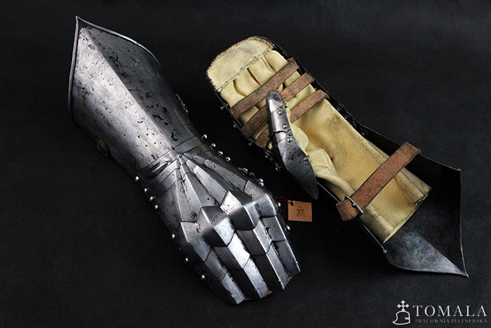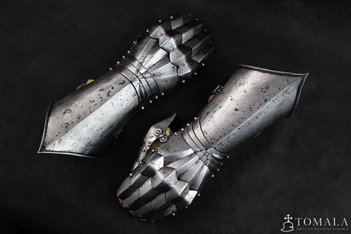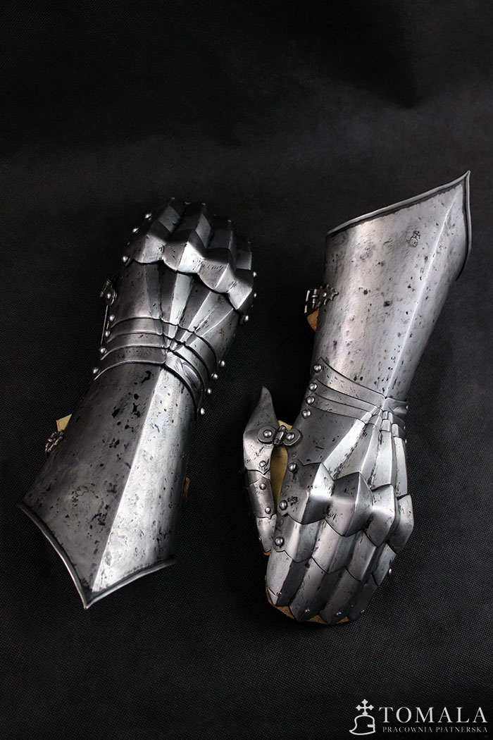 Rękawice, druga połowa XV wieku. Wykonane na podstawie zachowanego oryginału. Produkt nie spawany. Blacha 1.5mm, 1.2mm oraz 1.0mm. Powierzchnia kuta, szlifowana, pozostawione ślady po kuciu (*6) + ślady po pilniku. Produkt nie jest spawany.