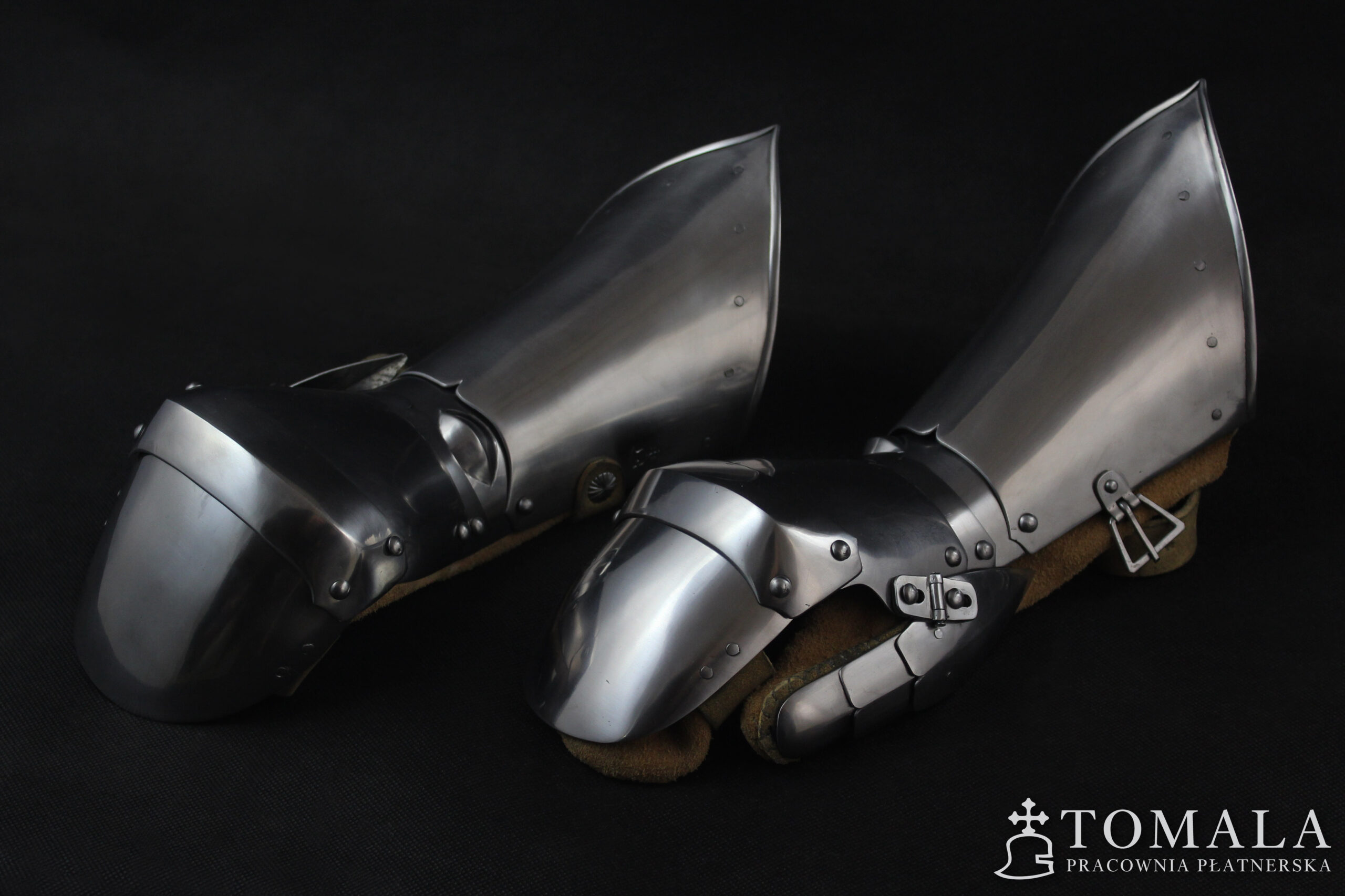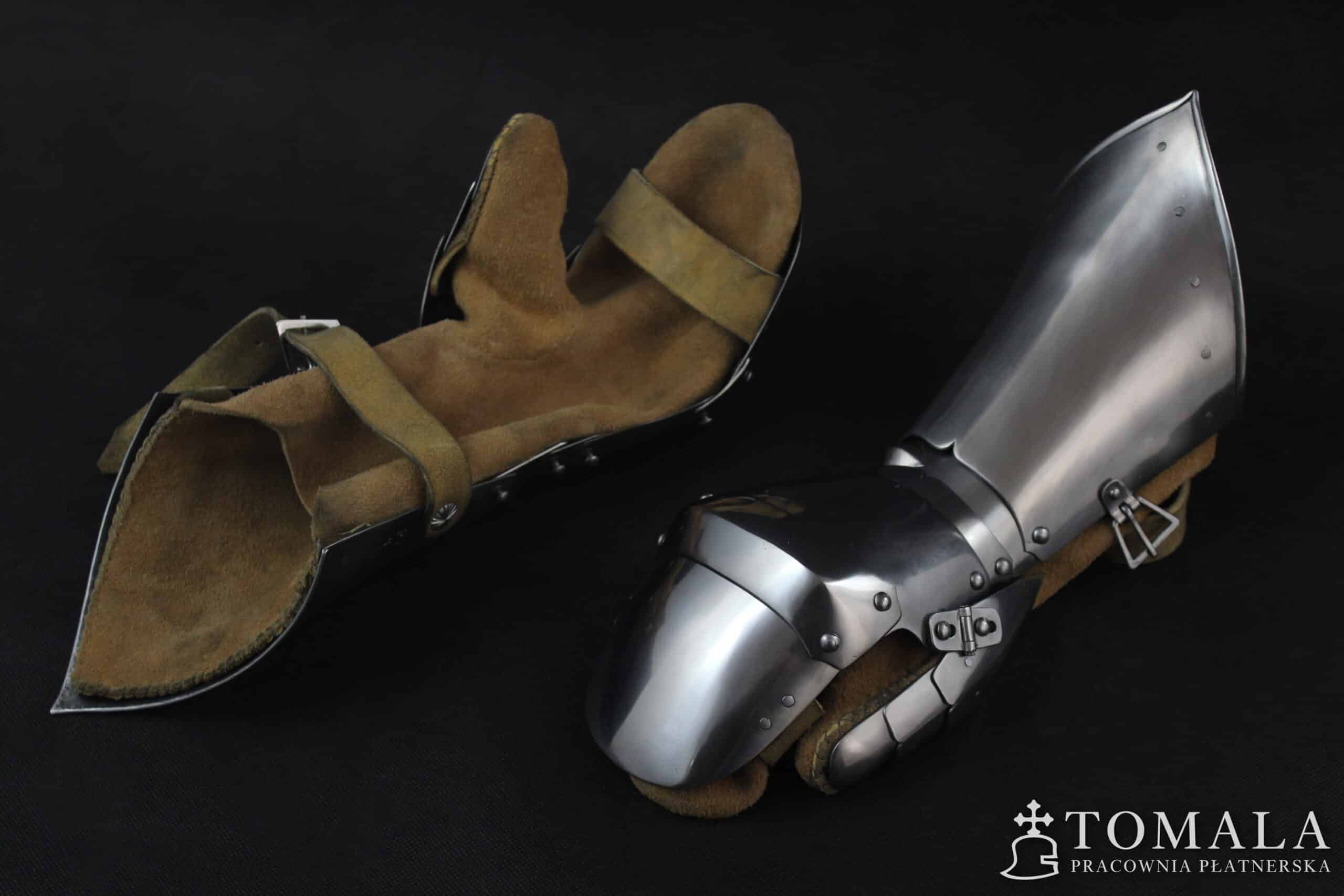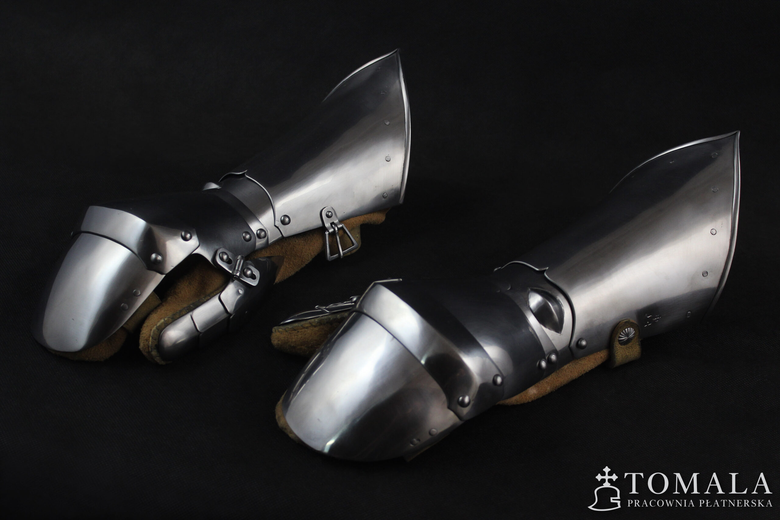 Rękawice typu mitynki, wykonane na podstawie zabytku w znajdującego się w muzeum w Leeds (Royal Armouries w Leeds), datowane na ok. 1490r. W zachowanym oryginale nie zachował się kciuk, został oderwany. Blacha 1mm oraz 1,5mm. Całość jest kuta, a następnie szlifowana i ręcznie polerowana (*2). Produkt nie jest spawany.