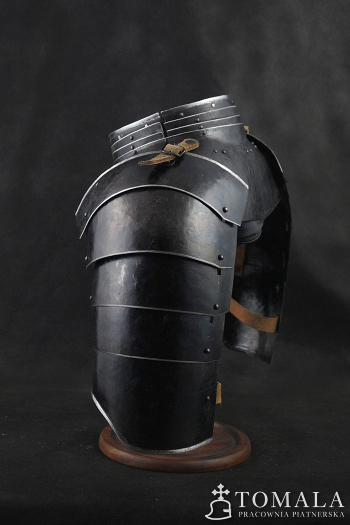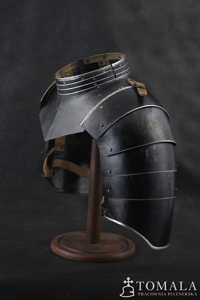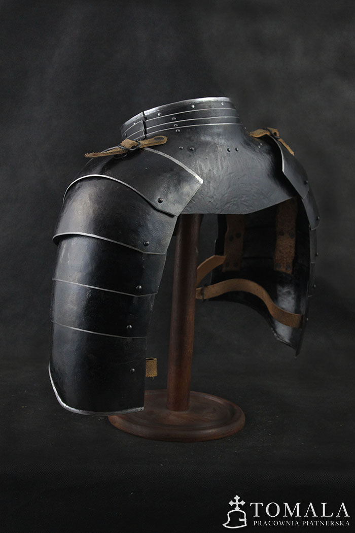 Naramienniki i obojczyk XVII wiek, wykonany na podstawie oryginału. Wykonane z blachy 1,5mm oraz 1,2mm. Powierzchnia kuta, czerniona woskiem pszczelim (*5). Produkt nie jest spawany.
